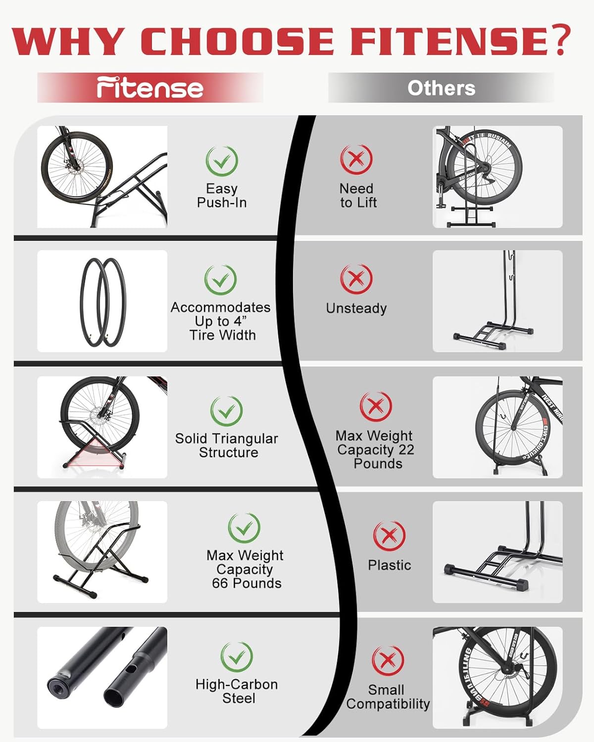 - Versatile Bike Storage Solution for All Ride Types: The Fitense Vertical Floor Bike Rack offers heavy-duty storage with 4-inch-wide tire compatibility, making it ideal for 20"-24" kids bikes, 26"-27" mountain bikes, and 650c-700c road bikes. With a 66 lbs/30 kg weight capacity, the adjustable lift rod and hook provide customized fit for different frame sizes, ensuring secure storage without tire or gear damage
