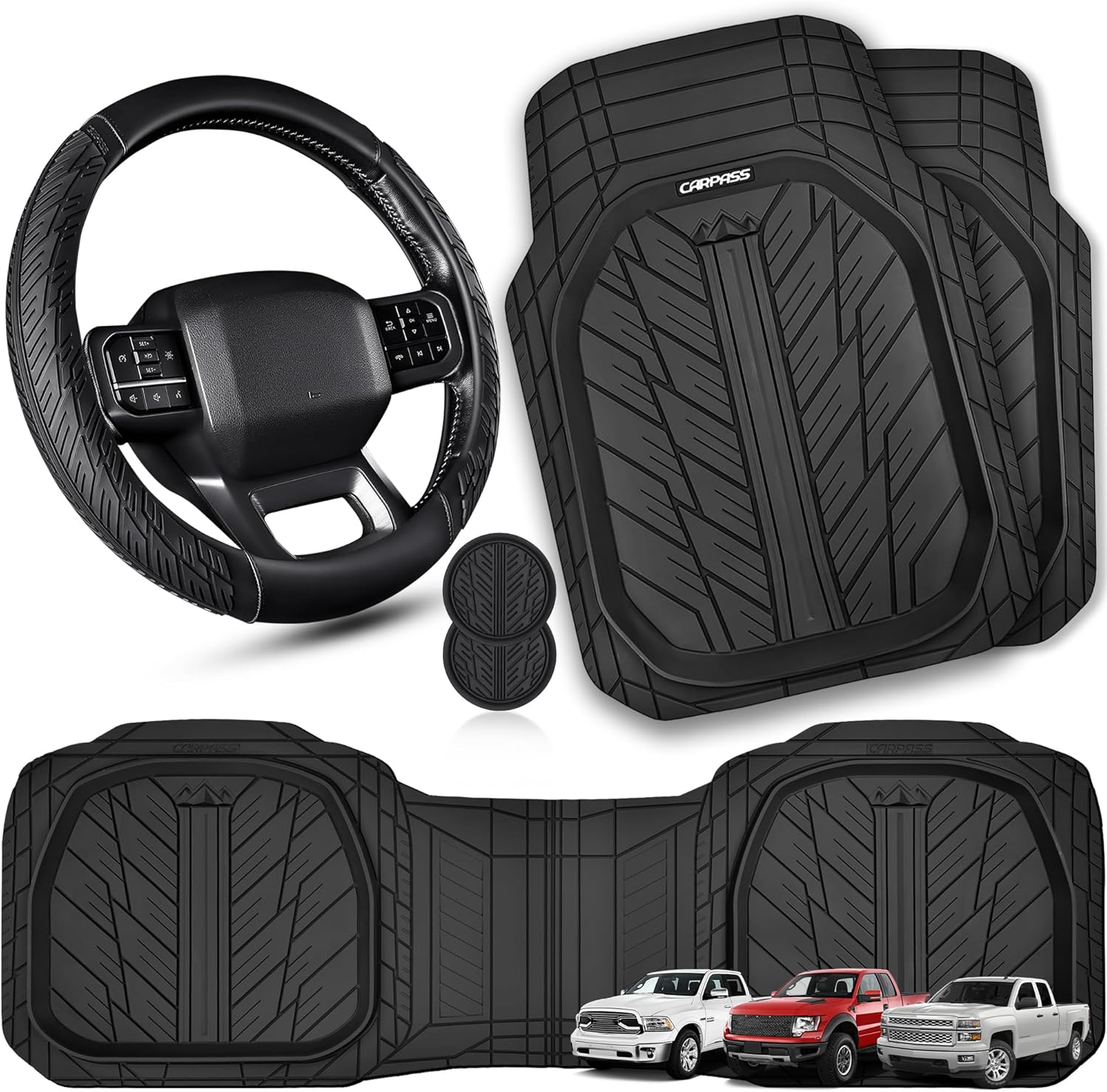 CAR PASS Rubber Leather Steering Wheel Cover Large-Size 15.5-16 Inches Fit for Truck SUV Large Car Ram F150 Tundra 4Runner Tacoma, XXL Heavy Duty Deep-Dish Car Floor Mats, Trim-to-Fit Car Mat Black