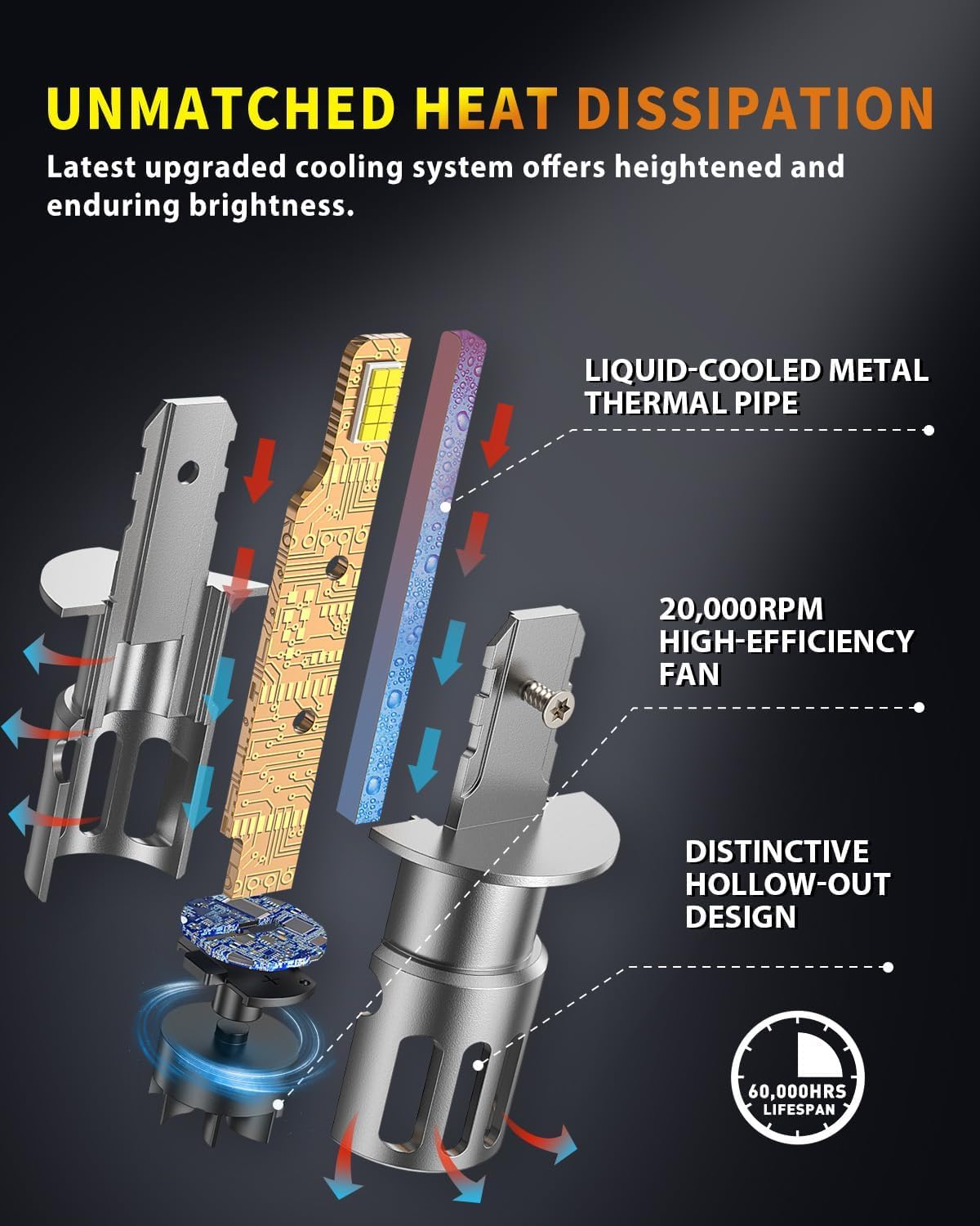 - Built to Last: Crafted with aerospace-grade aluminum and engineered for durability, these H1 bulbs can withstand extreme weather conditions and heavy use. Featuring a high-speed 22,000 RPM cooling fan, they promise over 60,000 hours of consistent, reliable performance