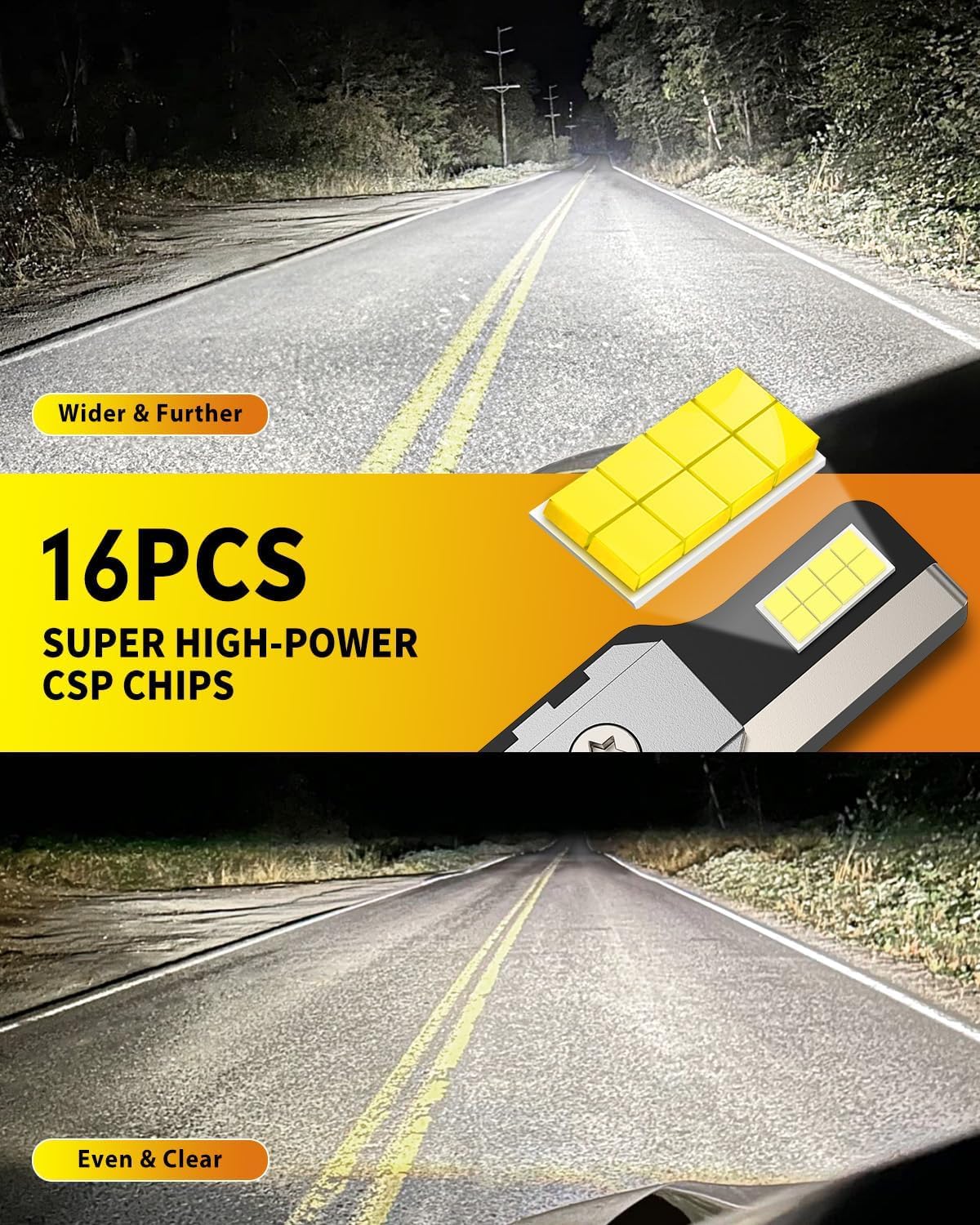- 800% Superior Brightness: Upgrade your driving experience with our high-performance bulbs, powered by 16 advanced CSP chips. These driving lights combine cutting-edge technology with powerful illumination, ensuring superior visibility and a seamless night driving experience like no other
