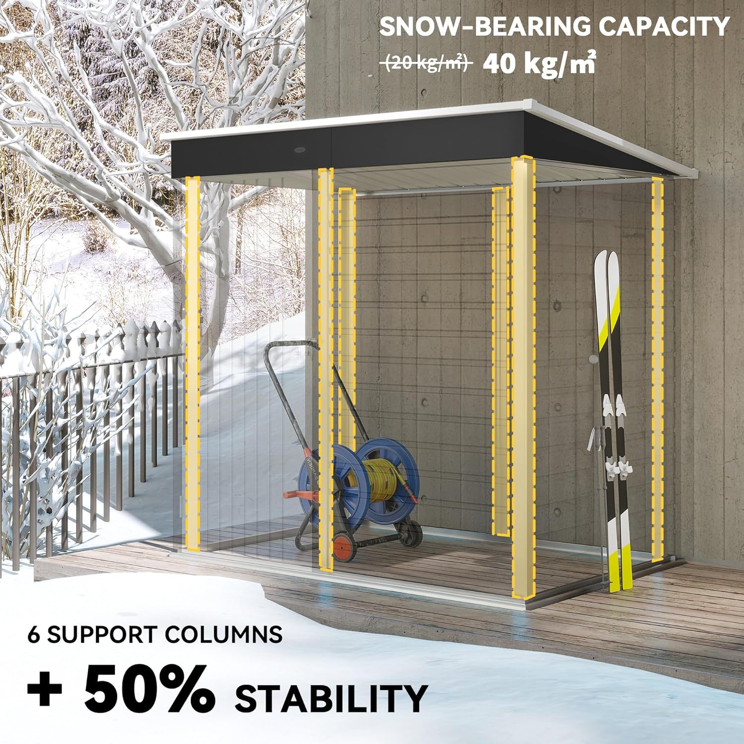 • Enhanced Stability & Strength: Our outdoor shed features 6 support columns (the traditional ones have only two door frame columns). Ensure your outdoor belongings are protected year-round. Foundation kit included.
