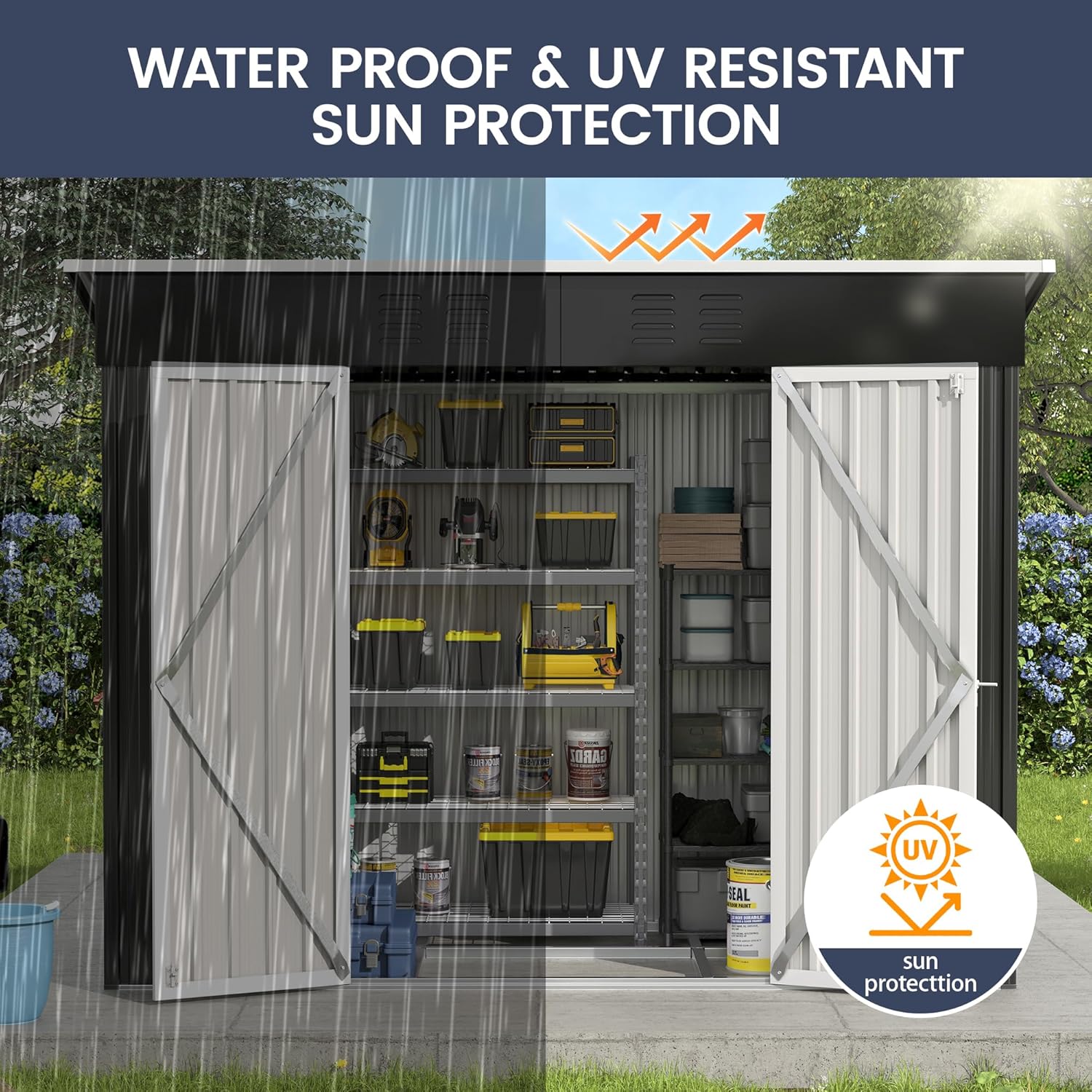 - Sturdy Storage Shed Thicker galvanized steel construction and fewer accessories makes this shed rustproof and UV-resistant. Overlapped wall panels features with waterproof and moister-resistant, worry-free for all weather condition use