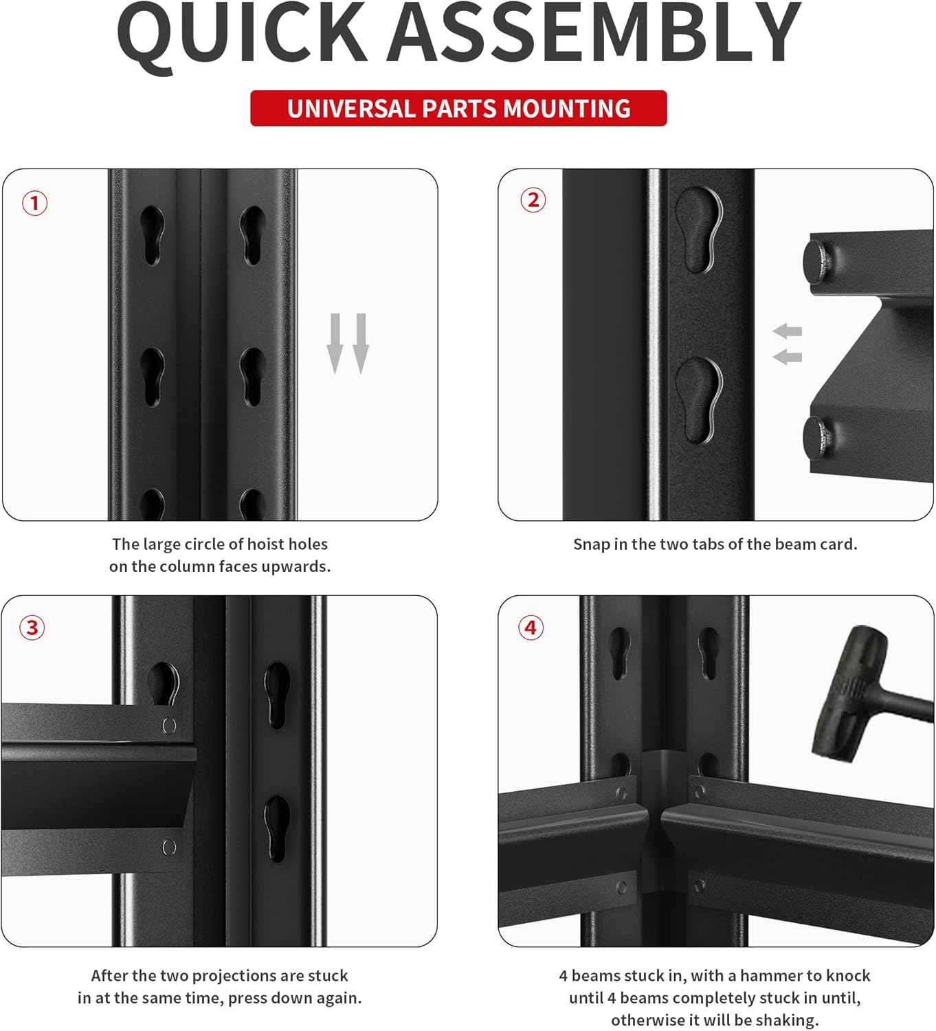 - 🦴【Adjustable Shelves for Versatility】The metal shelving unit offers adjustable shelves, allowing you to customize the height to fit items of different sizes. Perfect for organizing everything from small tools to large storage bins, this garage shelving unit provides versatile storage options.
