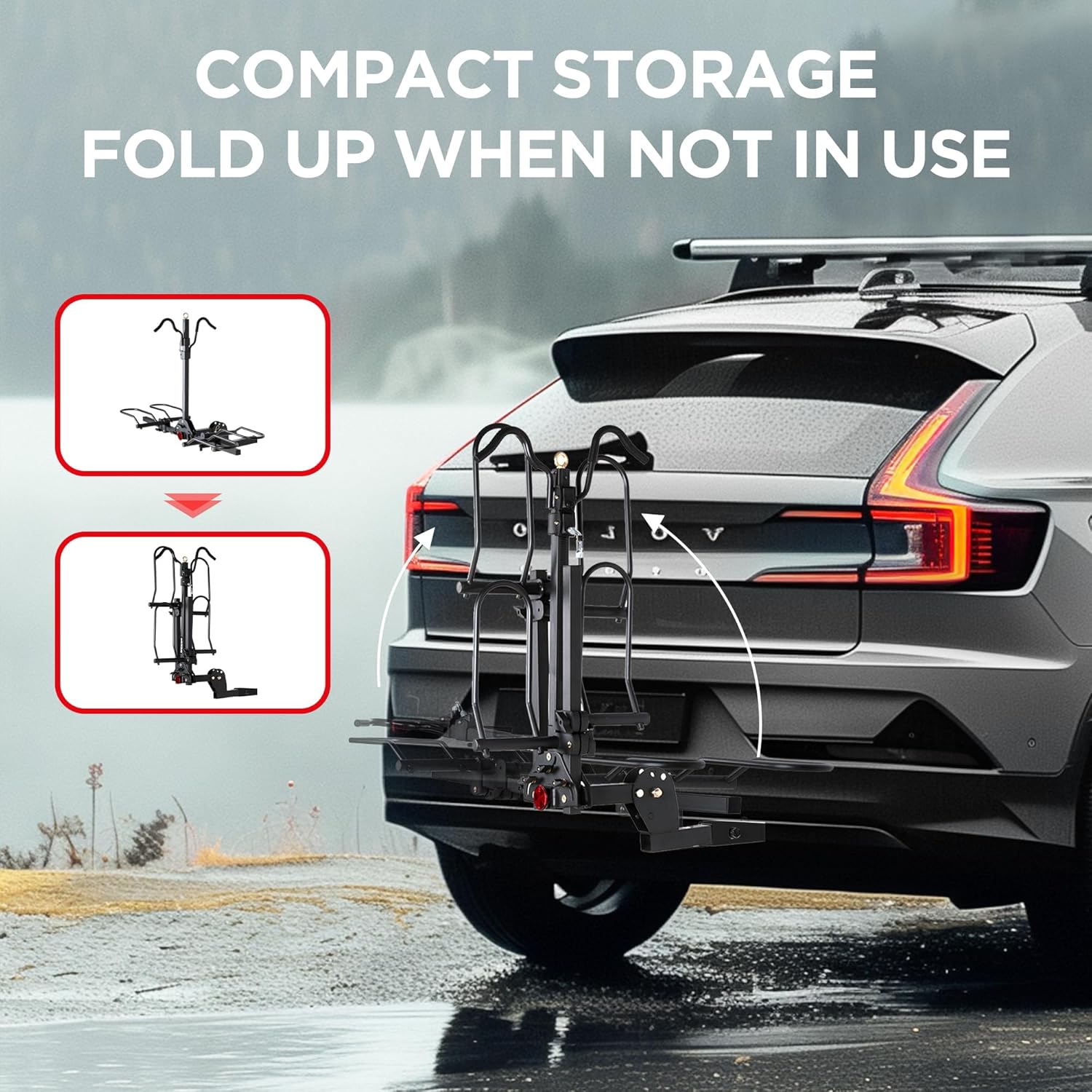 - FOLD WITH EASE: This rack can be easily folded up when not in use. You do not need to take it off from your vehicle in the garage at all because it won't take too much space. You can easily fold the 2 brackets up to the vertical adjustable tube. Meanwhile, this rack can also be tilted down smoothly. You can have an easy access to the car trunk without taking off the bikes.