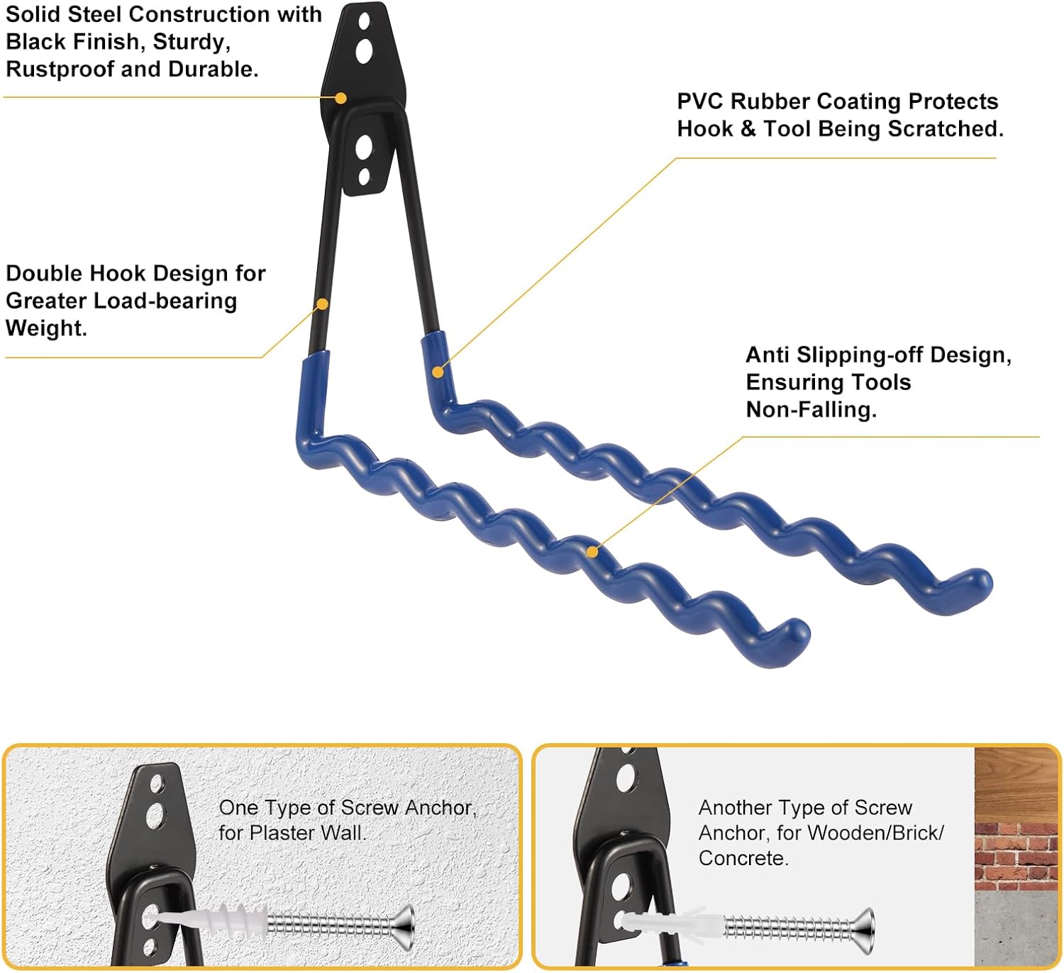 - Blue Rubber Coating & Dual-Hook Design: Wall storage hooks with blue rubber-coated design efficiently holding tools against scratches and rust, also dual-hook design keeps garage hooks with classic but elegant look.
