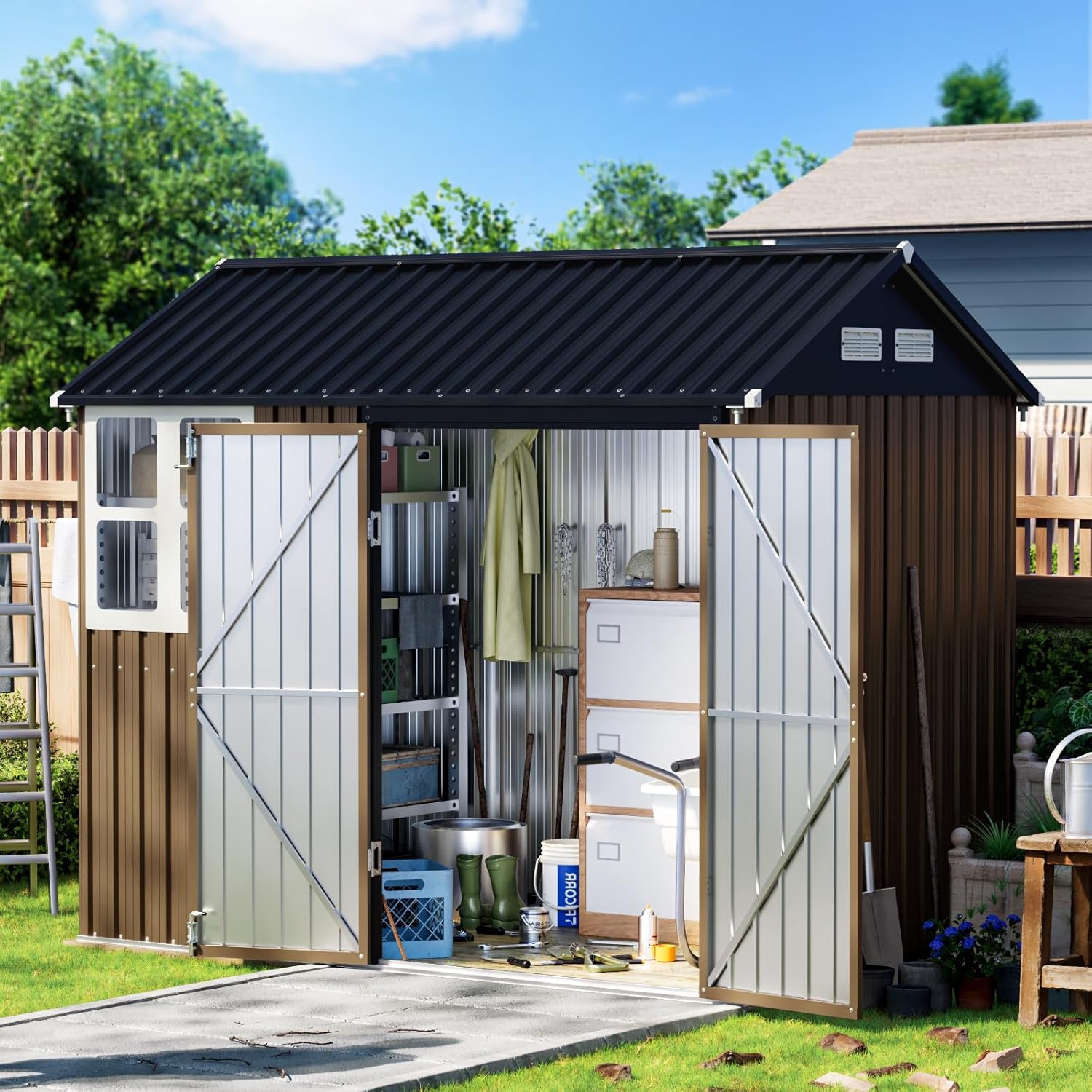 8X6FT Outdoor Steel Storage Shed with Lockable Doors, Frame Floor (No Wood/Other Boards),One Window,Ideal for Garden, Backyard, Patio Storage,Brown