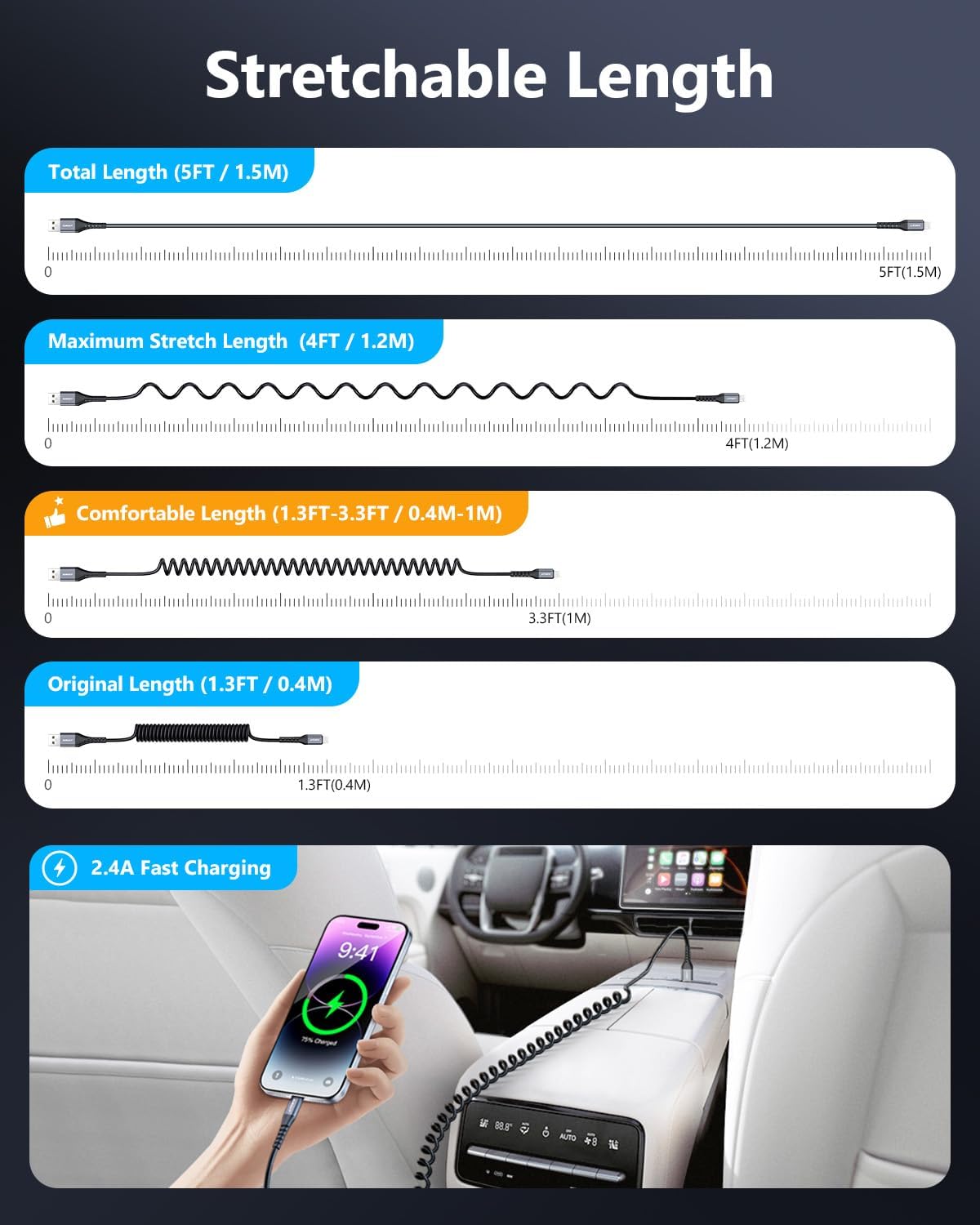 - ăCoiled Lightning Cable for CarăRetractable iPhone charger cable with spring-shaped design, anti-tangle. Compact and portable solution to keep your car console neat and organized; stretches up to 2-3 feet when needed and easily returns to its original 1-foot length.