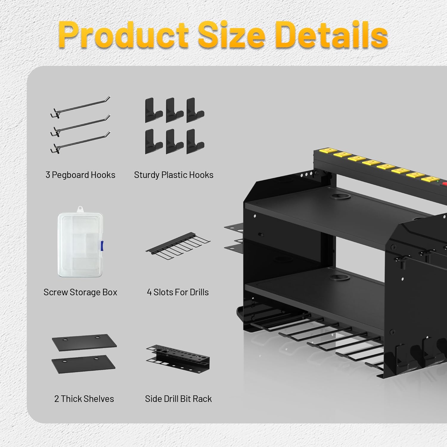 - MULTIPLE TOOL STORAGE:Utility rack size:L:16.4 in*W:8.8 in*H:11.8 in(Accessories size not included).Side added drill holder,hooks,screw organizer,carrying tool kit;Drill organizer wall mounted on concrete wall with a maximum load of 130 lb