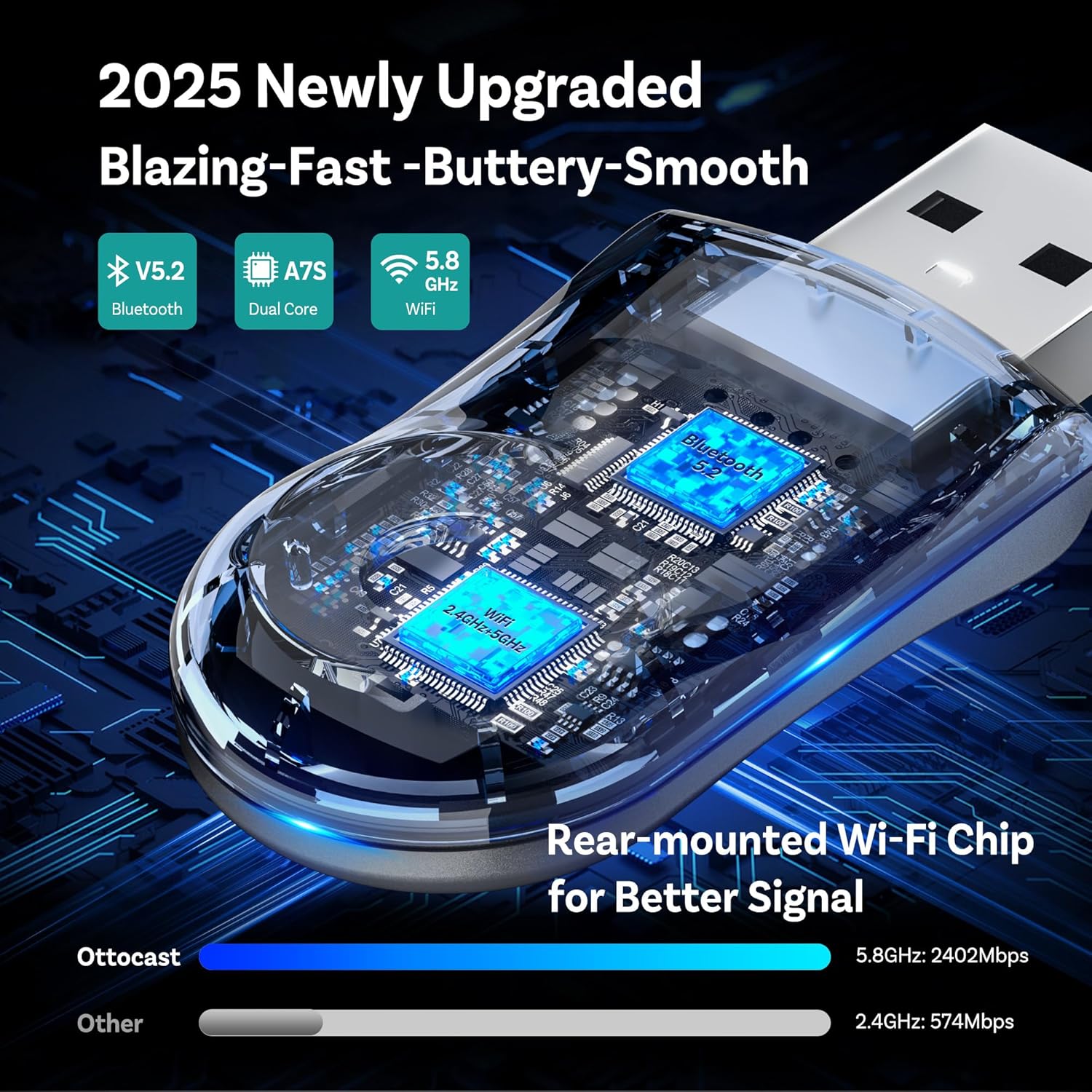 - ăBlazing-Fast ConnectivityăThis Apple CarPlay Android Auto wireless adapter is loaded with 5GHz WiFi, Bluetooth 5.0, and a next-gen chip for lightning-fast 10s setup and a buttery-smooth 5-second Auto-Reconnect. Get 3x faster speeds, silky performance, and glide through navigation, music, calls, and messages via Siri, touchscreen, or buttons. Rock-Solid connectionâwhether you're road-tripping coast to coast or hitting low-bars areas, the OTTOCAST MINI keeps the good times rolling.