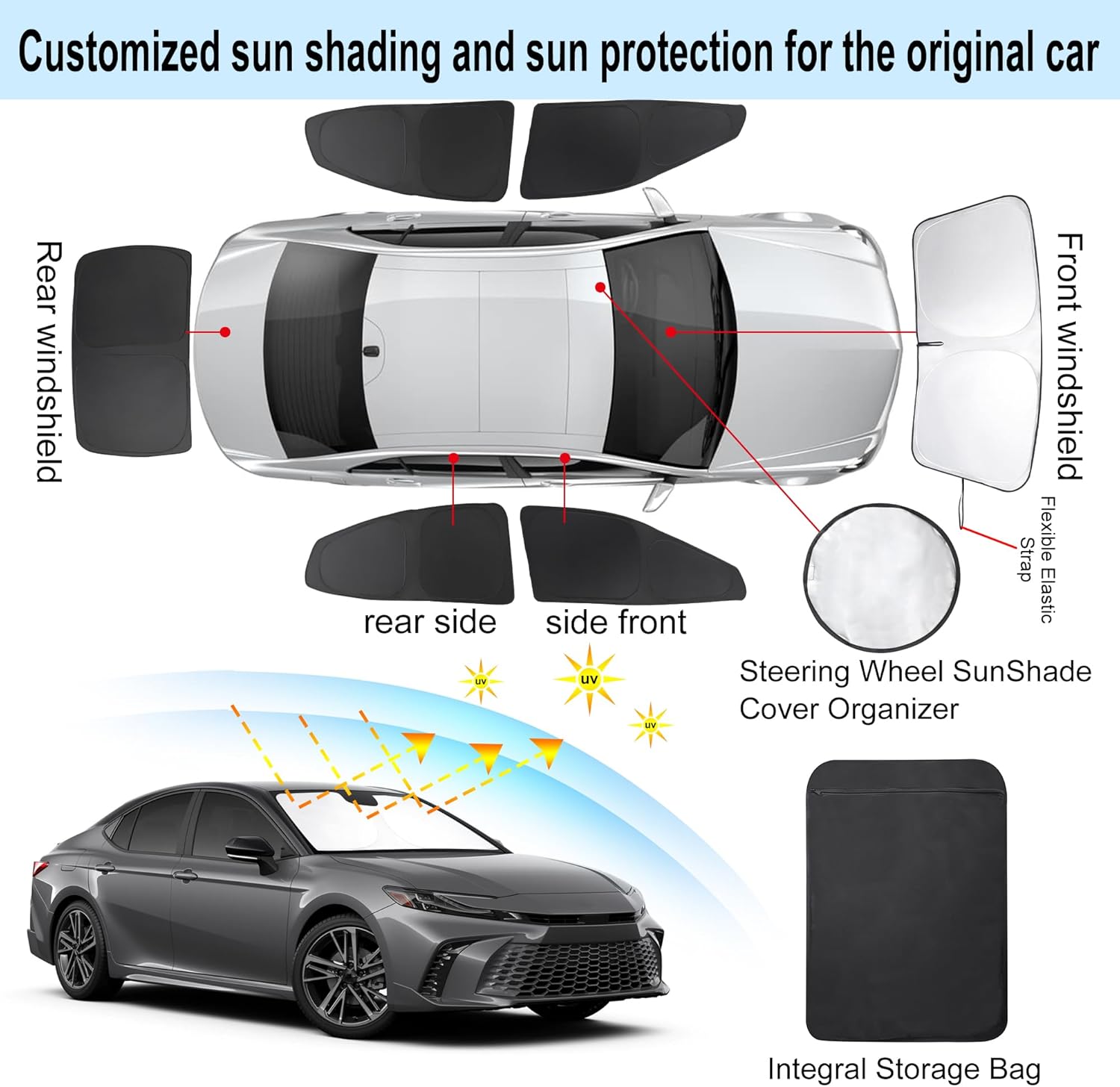 - Customized Design:The sun shade custom fit for Toyota Camry 2025.Our window shade is according to the car size design,perfectly fit your car and does not need to trim.windshield sun shade solve the problem of light leakage and incompatibility of the old umbrellas.The sunshade designed for Toyota Camry.