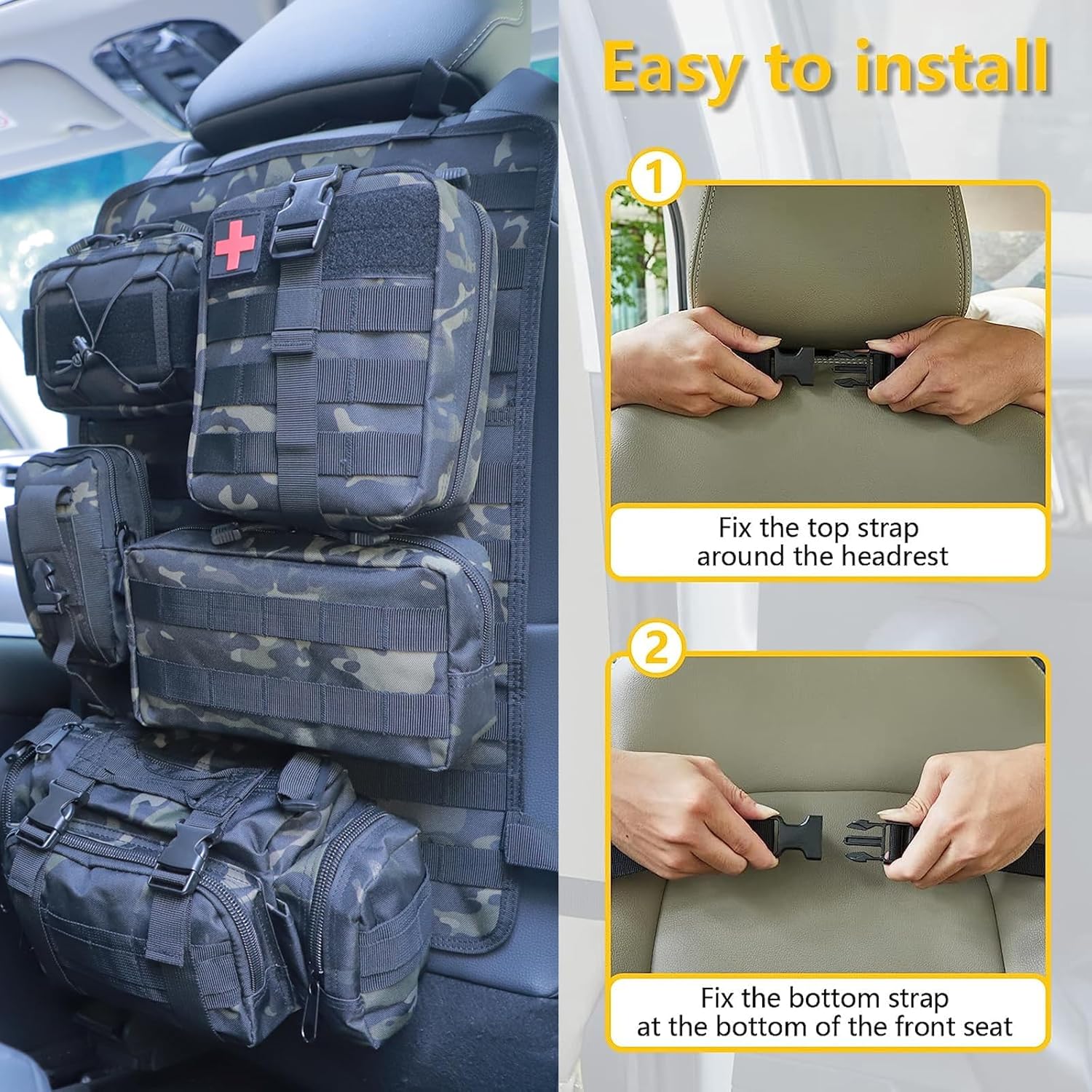 - π Easy Installation - With adjustable strap,easily adjust to fit around your headrest and at the bottom between the seat back and base.Each Molle bags has been designed with velcro tape and buckle, each pouch is flexible to be added or removed.