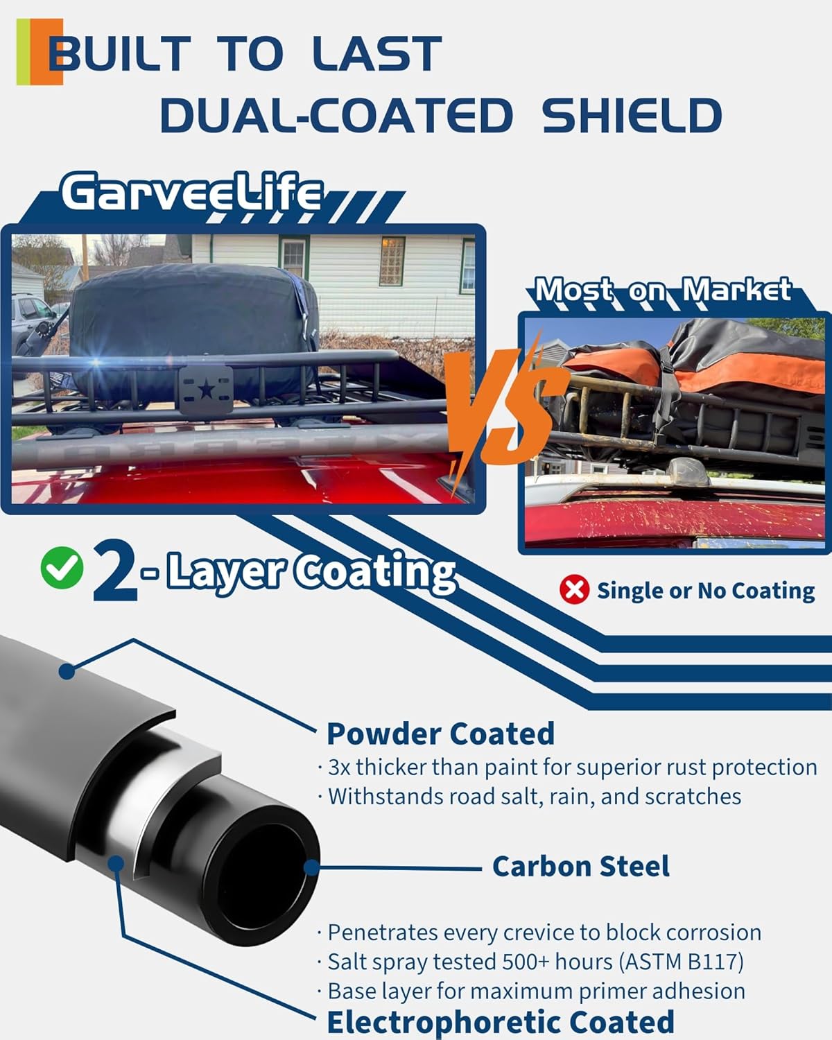 - 【BUILT TO LAST】The GarveeLife Universal Roof Rack Basket integrates powder-coated steel and electrophoretic technology to resist rust, corrosion, and extreme weather. Engineered for heavy-duty performance, it safeguards cargo during cross-country trips, camping, or long-term outdoor storage—built tough to outlast every adventure