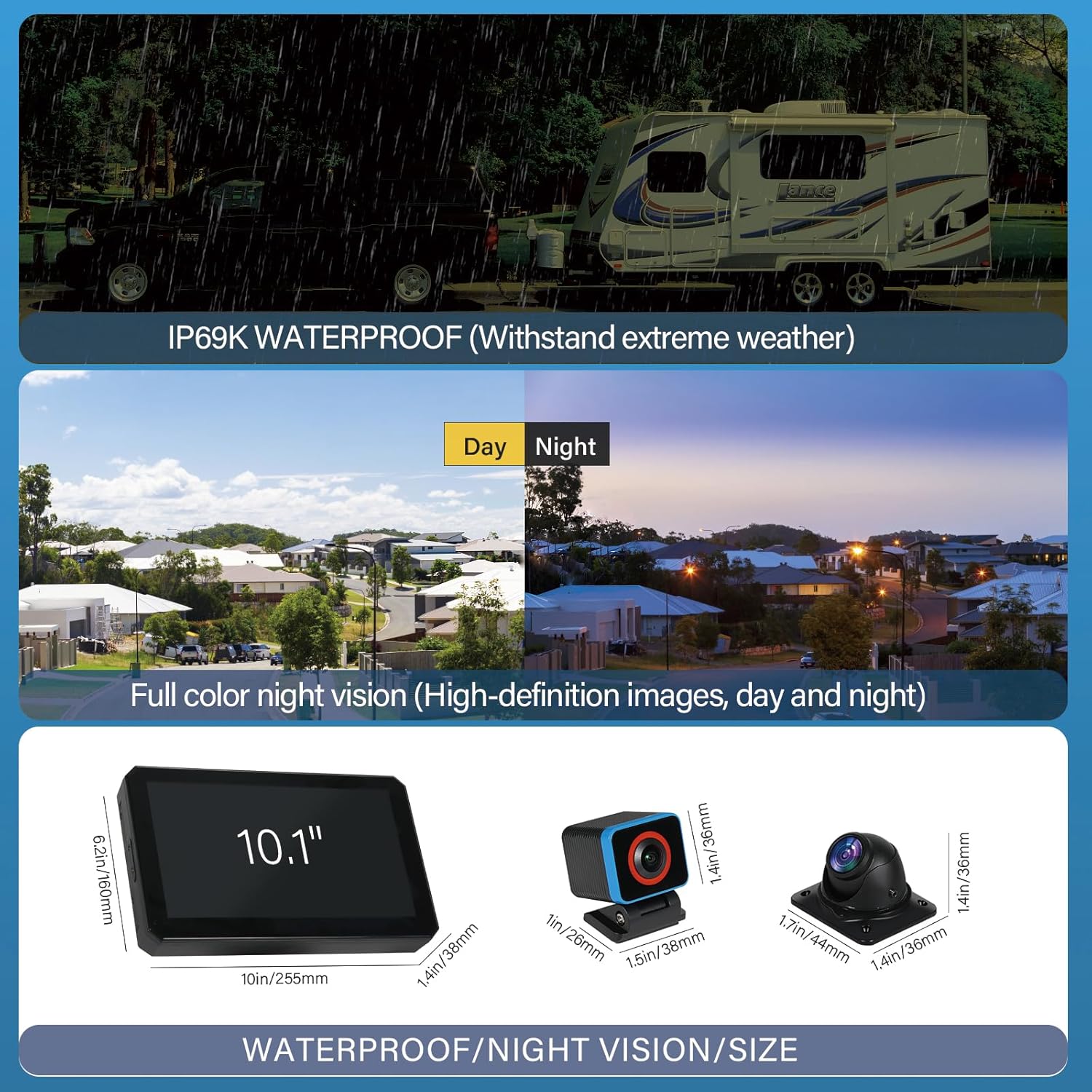 - ăIP69 waterproof and Night Visionă Using full-glue sealing technology for cameras , the truck system can work normally in various extreme bad weathers. Full color night vision (High-definition images, day and night)
