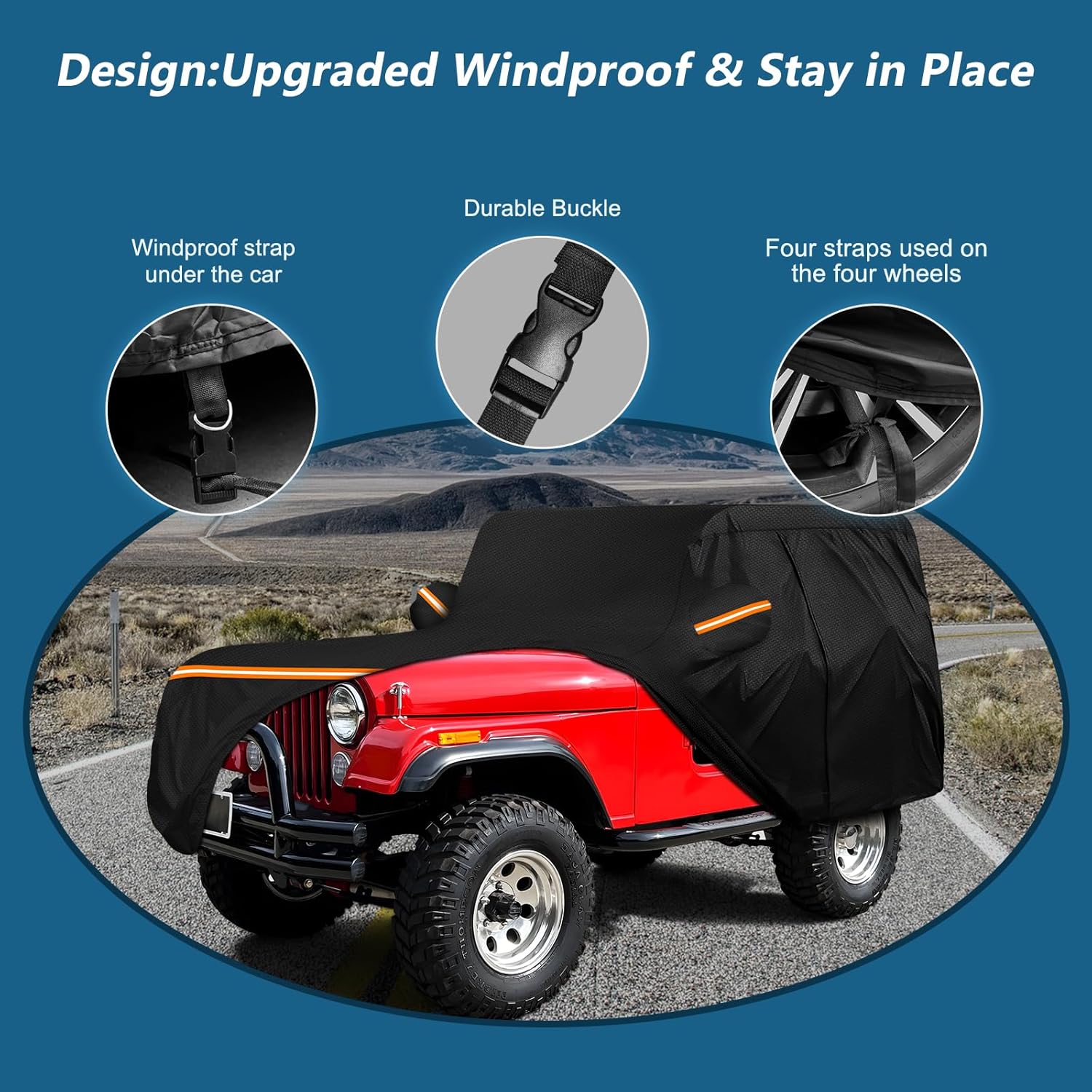 Car Cover for Jeep CJ5 1955-1983, Waterproof 210D Oxford Cloth and Cotton Cover Outdoor Full Car Covers with Zipper Windproof Heavy Duty All Weather with Wind, Sun, UV and Dust Protectio