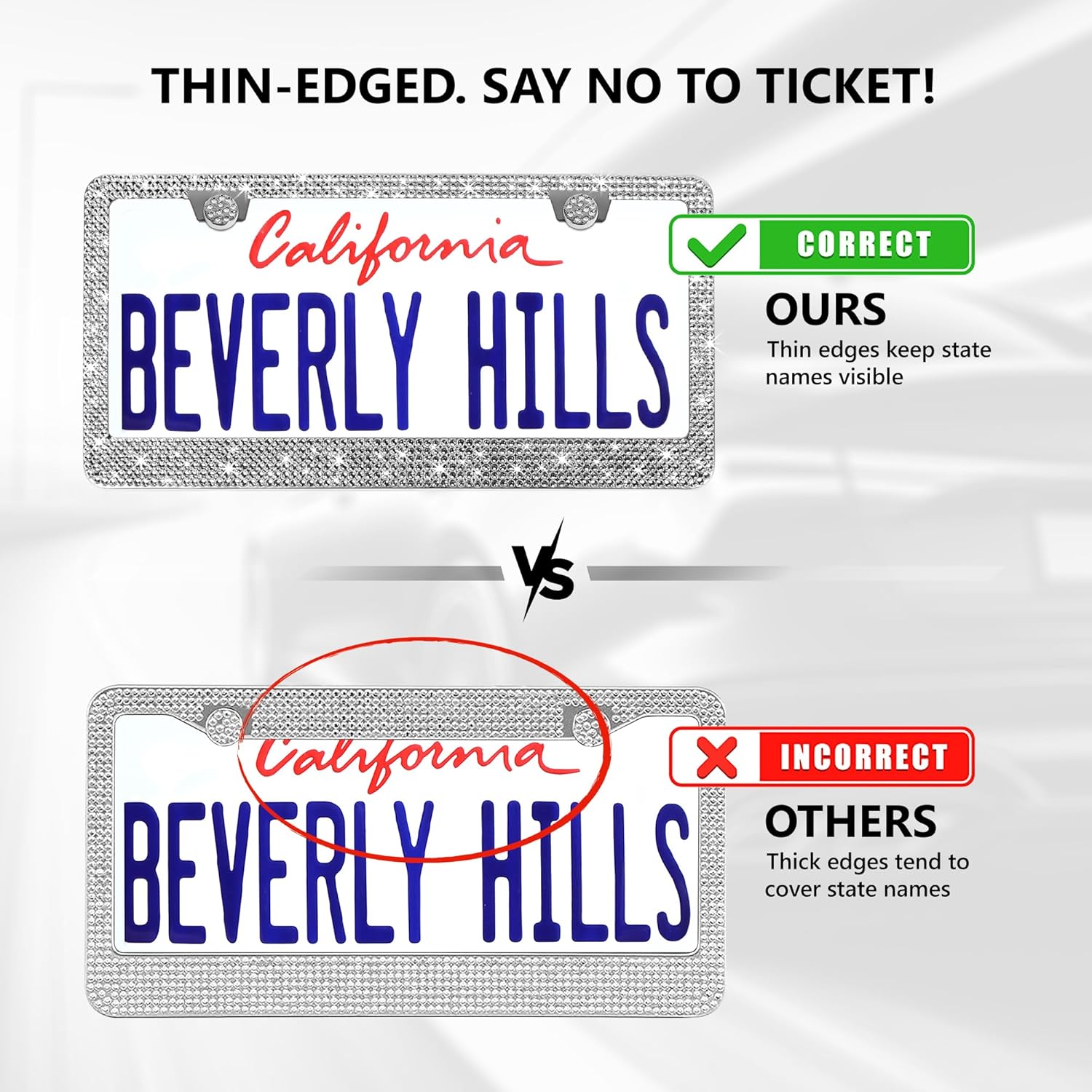 - PROTECTIVE DESIGN: Crafted from durable stainless steel, our diamond car plate frame offers superior strength, corrosion resistance, and stability. They prevent the diamond license plate protectors from bending or warping while protecting your car’s paint from scratches.