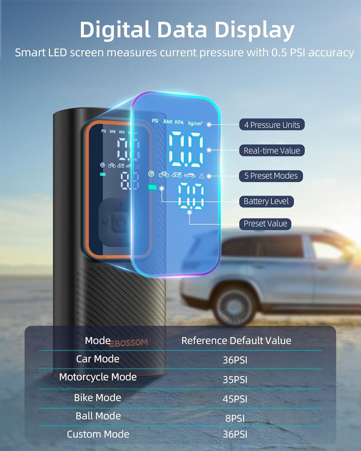 - USER-FRIENDLY DESIGN: This intelligent air pump boasts an LED display that accurately indicates the real pressure with precision of 0.5PSI. Set your desired pressure and it will automatically shut off when it's done. No more guessing or over-inflating