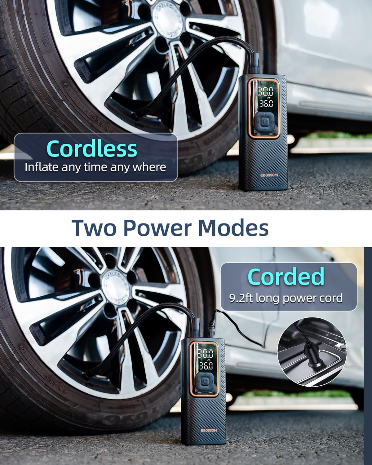 - DUAL POWER MODES: Charge this cordless car tire inflator up and use it directly, or plug it into your cigarette lighter if you forget to juice it up, always has a backup plan. Measuring just 6.5" x 2.7" x 2.0", fits easily in your glove box, trunk or backpack