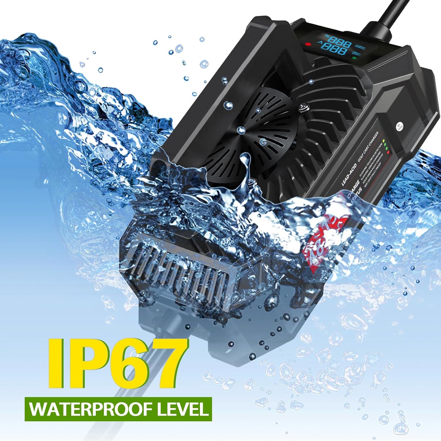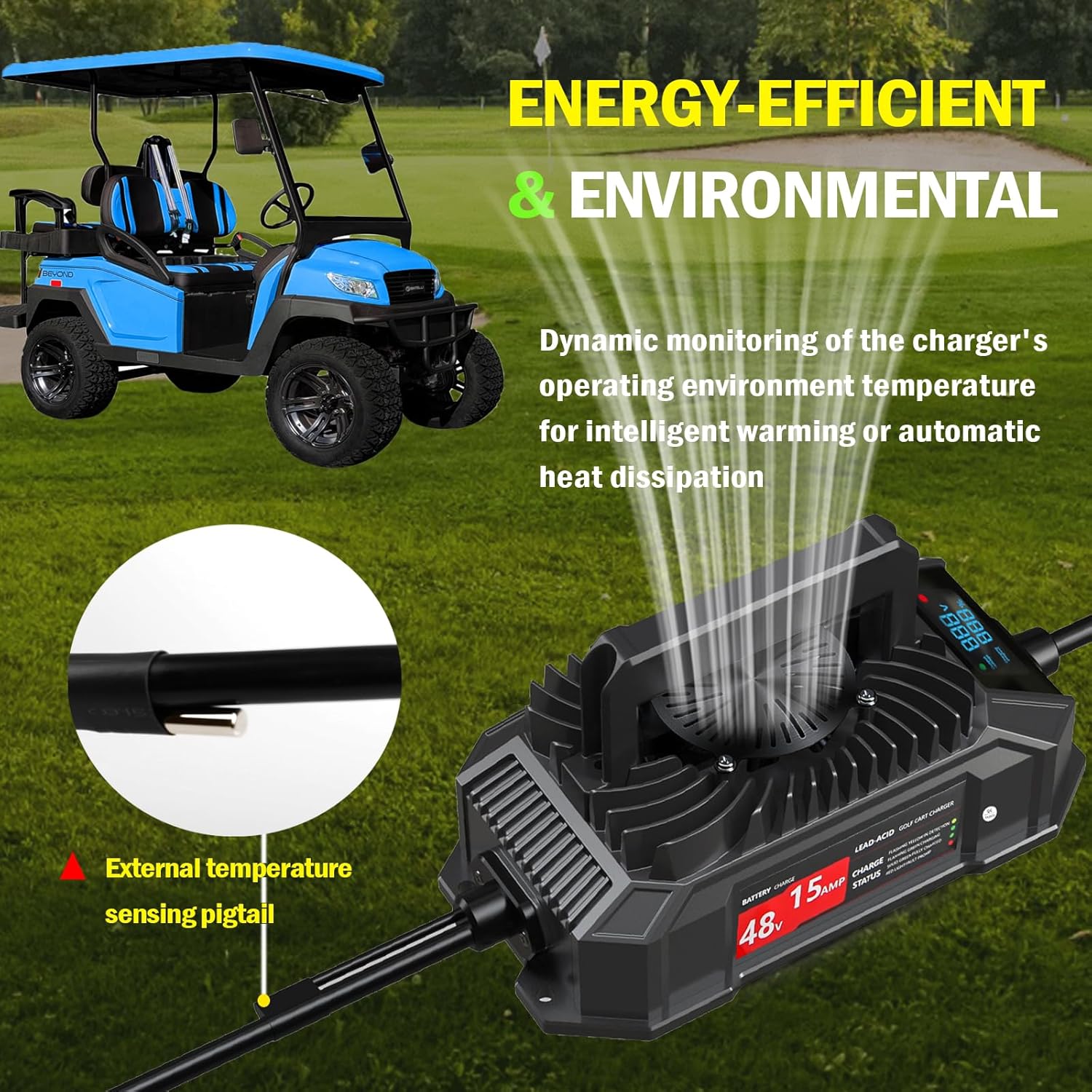 - Energy-efficient and environmental - When the temperature reaches 50Β°C, the fan will start to run to activate the cooling mode, unlike other brands of chargers, their fan runs constantly when plugged into the golf cart
