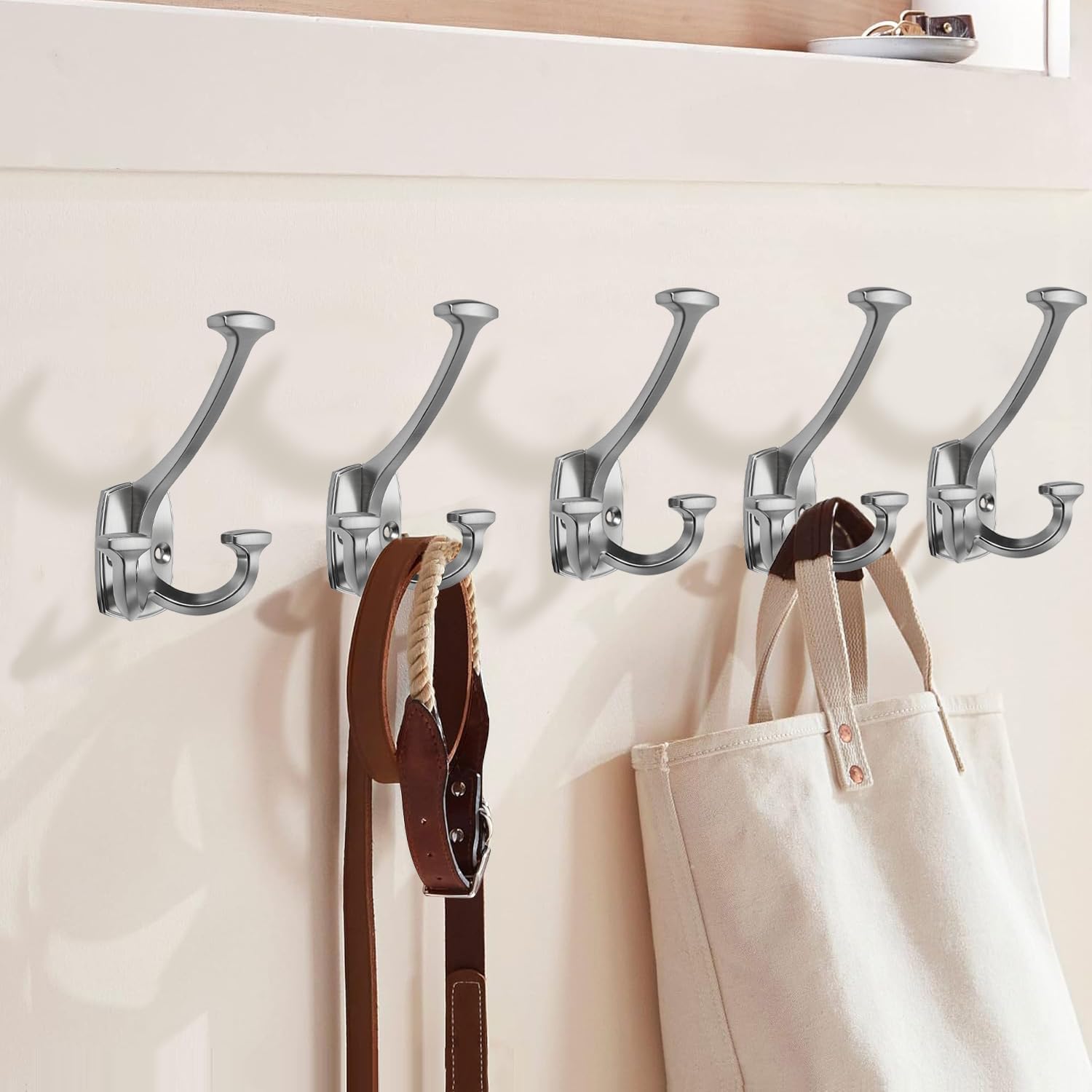 Large Wall Double-Sided Hook 5 Pack Brushed Satin Nickel Hook Decorative Heavy Duty Solid Large Coat Hooks for Towel Hanging Coats Robe Towel Bags Door Back 2 Prong Hooks