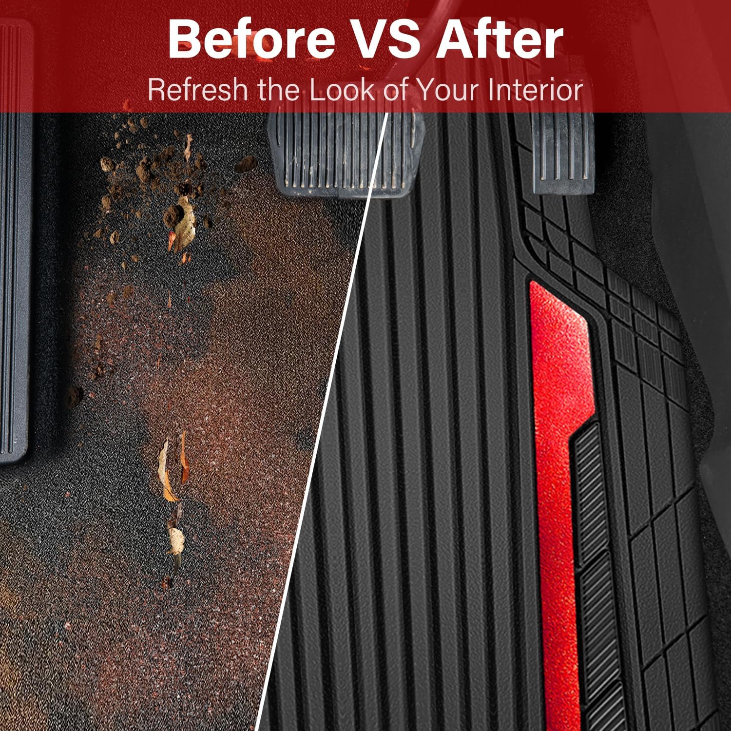 CAR PASS Heavy Duty Rubber Car Mats Metallic S~L Size, Aluminum Film All Weather Floor Mats Waterproof Universal Trim to Fit SUV Sedan Van Truck 4 Piece Deep Dish Two-Tone Sporty Black Red Chrome