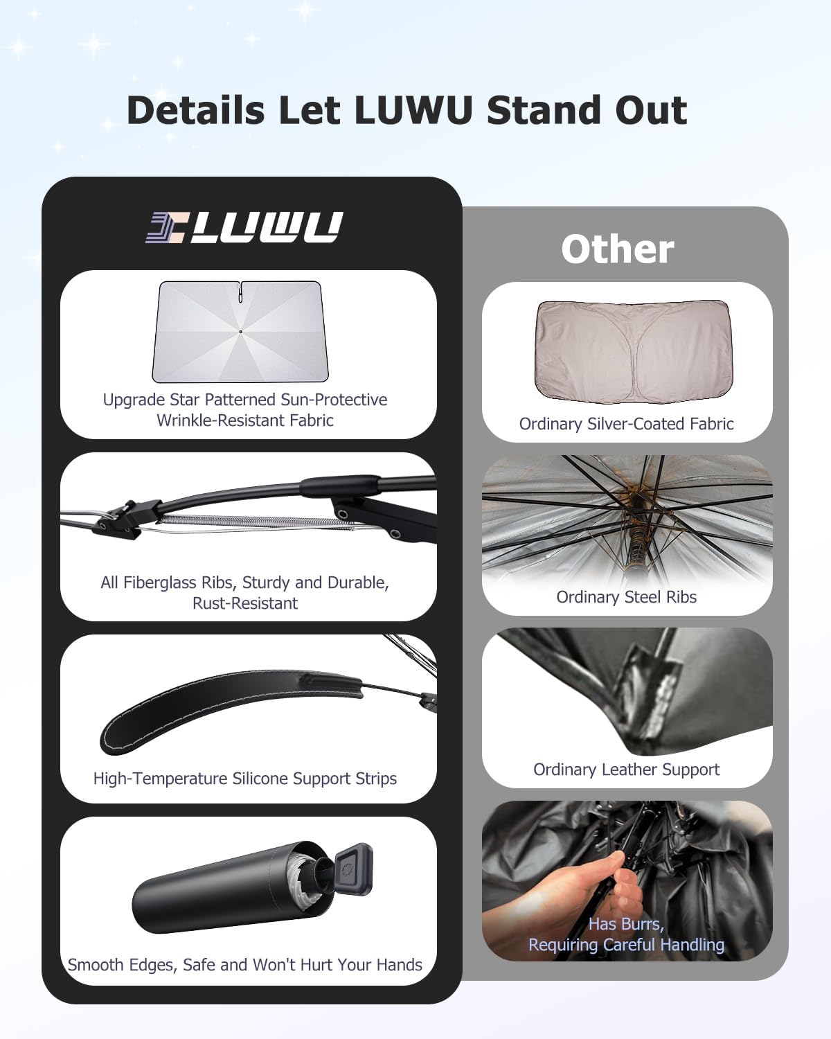 - [Excellent Sun Protection] car windshield sun shade abandons the traditional silver-plated fabric, and uses 240T high-density base cloth combined with polyester fiber high-temperature reflective cooling coating, special star fabric design, so that your car looks new. This advanced technology protects your car from all kinds of light damage and prevents the dashboard and seats from deteriorating