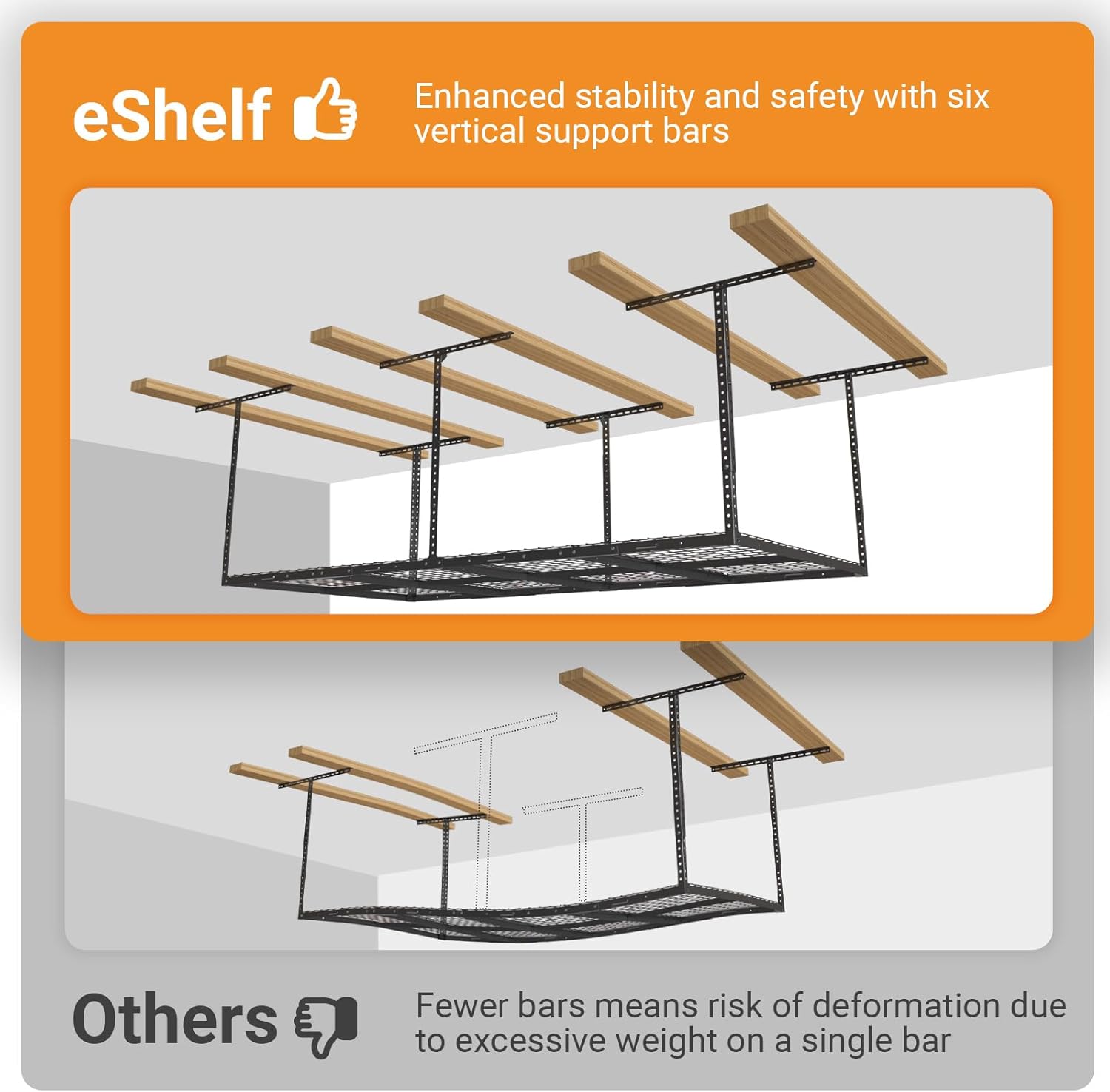 - Adjustable Height: The six vertical support bars can be adjusted from 22" to 40", making the rack suitable for different garage ceiling heights and accommodating items of various sizes.