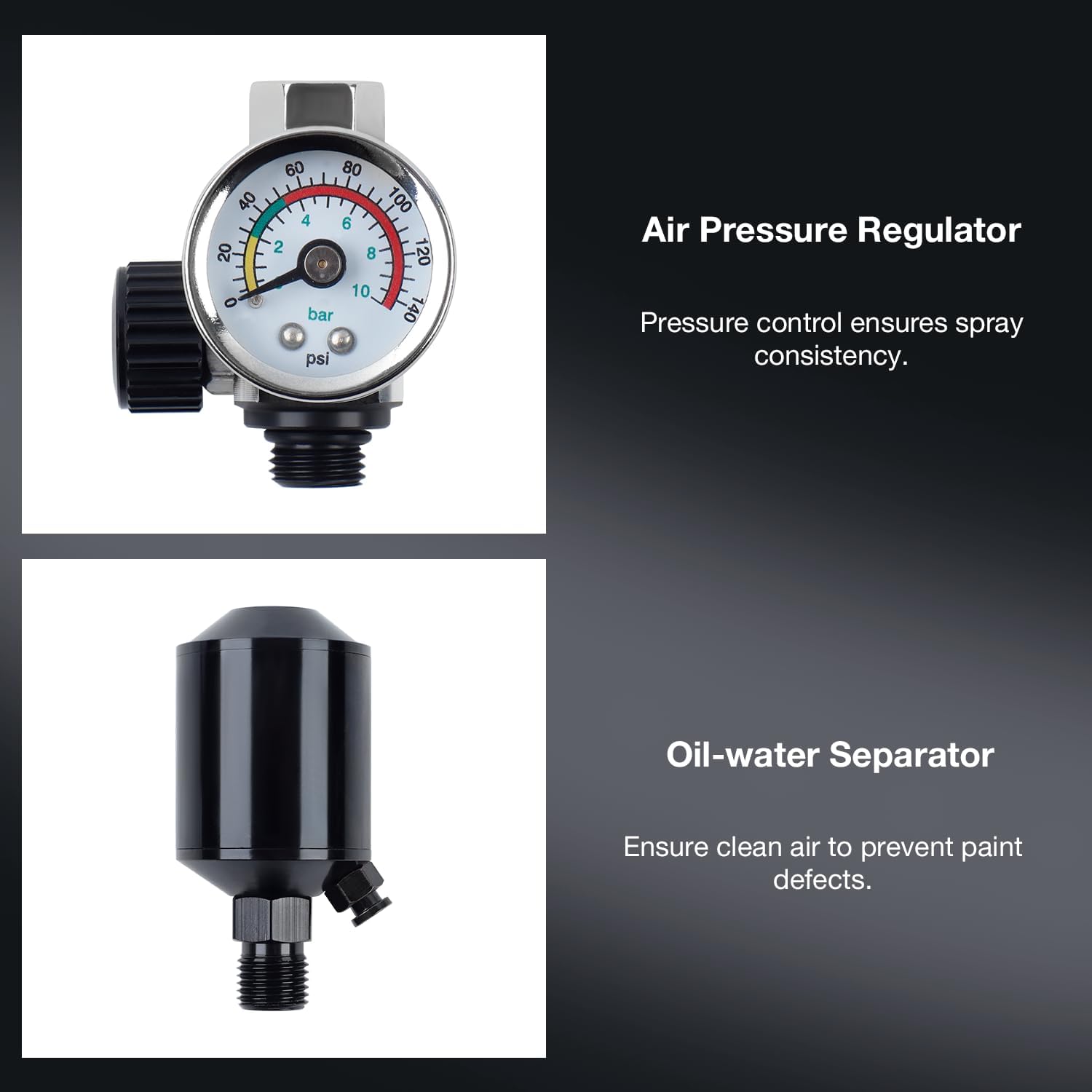 - Complete Kit & Lifetime Warranty: Includes HVLP auto paint gun, 3 nozzles (1.4/1.7/2.0mm), air pressure regulator, oil-water separator, 10 disposable paint cups with lids, 1 hard cups, 5 plugs, paint cup adaptor, 600cc cup, cleaning kit, PTFE tape, 10 flters cone and wrench so youโre ready to paint out of the box. Backed by a lifetime warranty for long-term reliability.