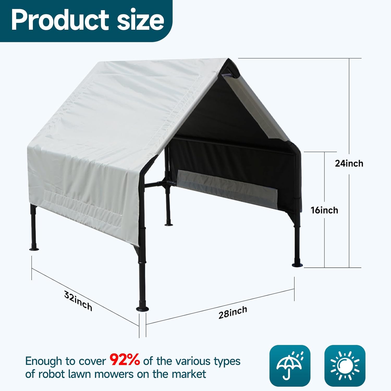 - CNAINFC lawn mower garage products are suitable for the following brands of automatic lawn mowers, and the size is increased to 32' x 28' x 24', which can cover 92% of robot lawn mowers and their charging stations from rain, snow and harmful ultraviolet radiation. The garage will extend the service life of your lawn mower and its accessories. The large opening is convenient for use.
