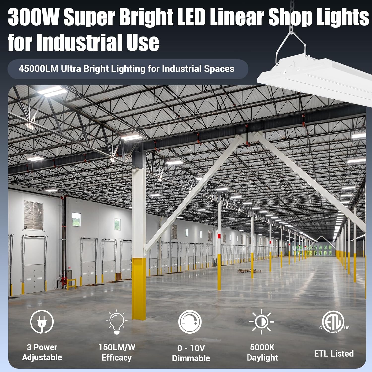 - HIGH EFFICIENCY & ENERGY SAVING - 300W LED linear high bay light adopts efficient SMD2835 LED chips, 45000LM, 5000K daylight, energy saving up to 95%, replace 1200W. Commercial led high bay lighting fixtures also increased light coverage, lower electricity bills.
