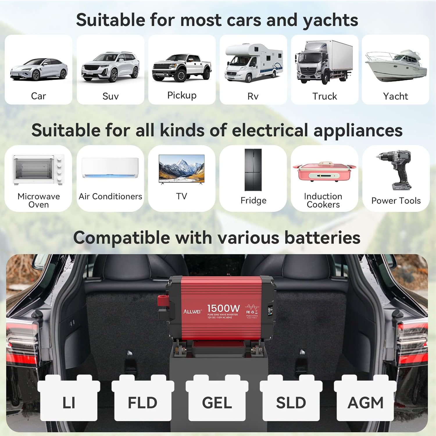 - ăUniversal 12V - Power Anywhereă: 1500 watt pure sine wave inverters is engineered for 12V batteries (vehicle start, RV auxiliary, deep-cycle), directly powers light loads (small appliances). A great setup for off grid or back up power systems, in addition to vehicle mounting. With versatile power solutions, supports parallel batteries and multi-battery switching, meeting temporary to long-term off-grid needs