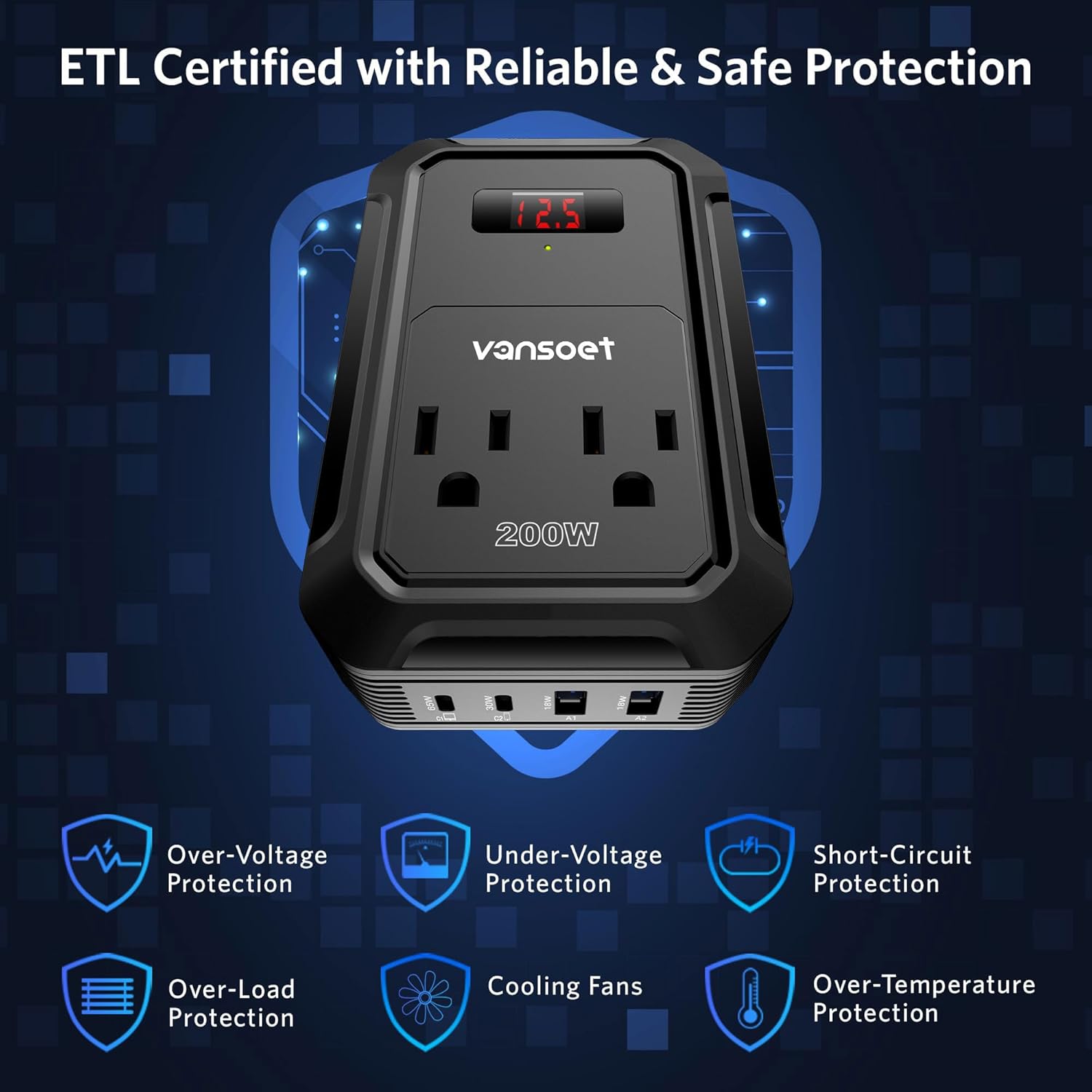 - Vansoet Advantage: America's leading power inverter brand. Provides 200 Watts continuous DC 12v to AC 110v power inverter featuring 2xPD (65W/30W)&2xQC 18W USB ports, 2 AC outlets, and a 23.8-inch cable with cigarette lighter plug and LCD Display for you, more convenient.