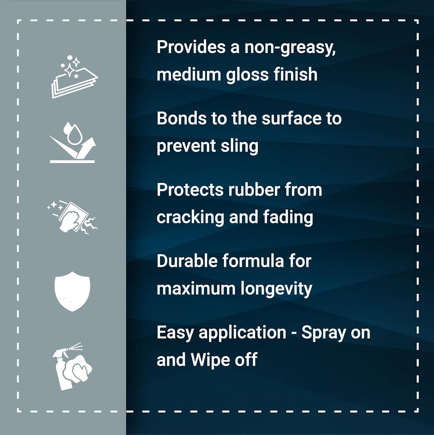 - PROTECTS RUBBER FROM DRY ROT, CRACKING & UV DAMAGE – Keeps tires flexible and looking like new with built-in conditioning agents.
