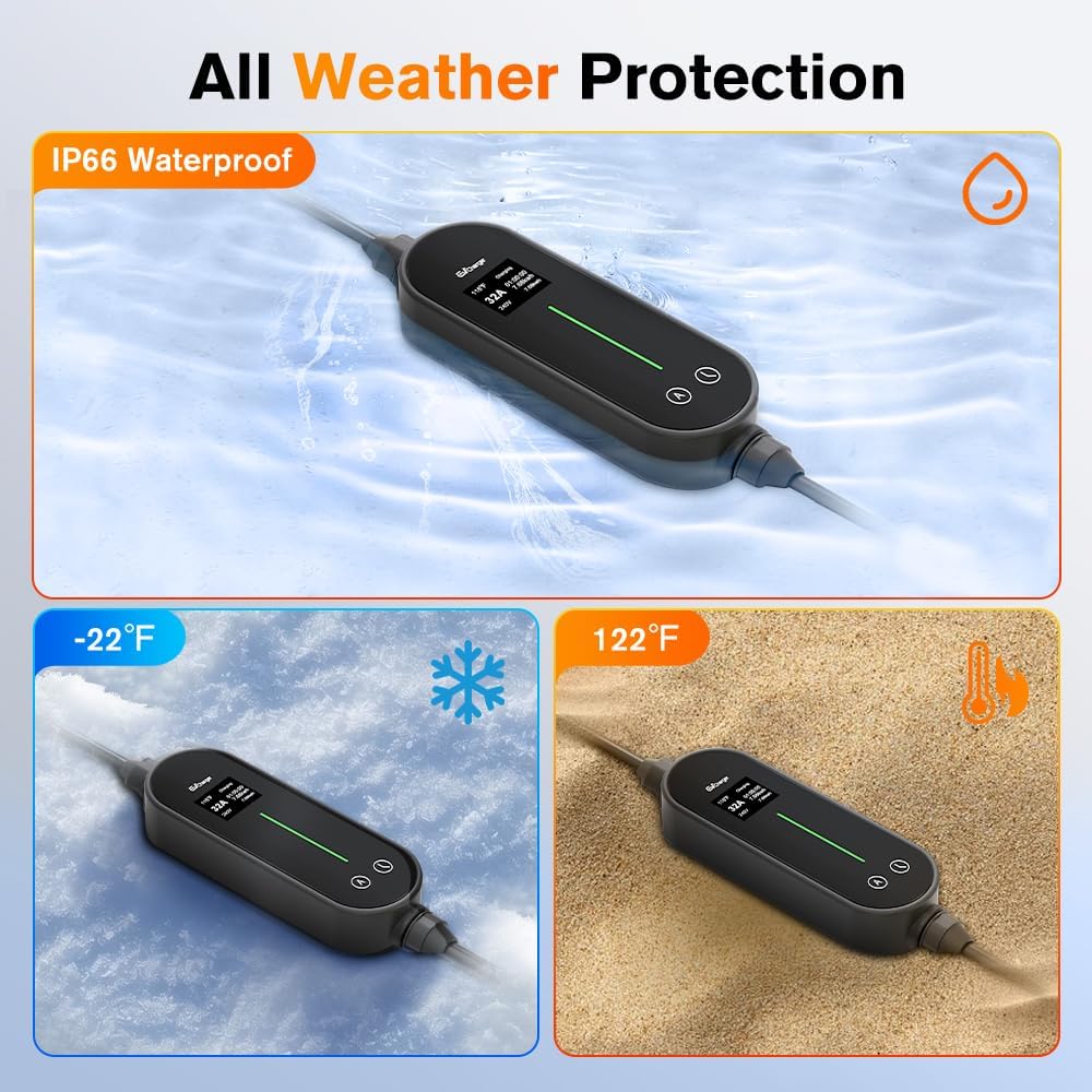 - ăSafer & Reliable Chargeră Safety is a top priority, which is why this charger is equipped with a LED indicator on the control box. This indicator displays the charging status of your EV, alerting you immediately to any potential issues. Additionally, the charger incorporates triple protection functions, including Leakag Protection, Overcharge Protection, and Under Voltage Protection, ensuring a safe and reliable charging experience.