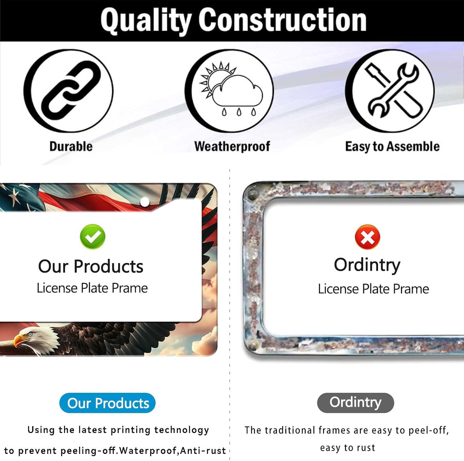 - DURABLE CONSTRUCTION: Made from premium quality metal with weather-resistant coating.Rain or Shine, Stay Secure β Our Rust-Proof Eagle License Plate Frame Wonβt Budge at Any Speed!