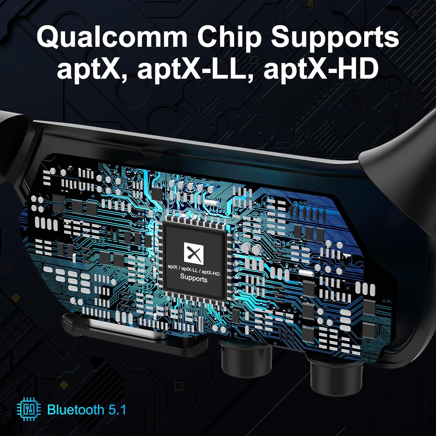 - [QCC3034 Chip|40ms Ultra-Low Latency]: Powered by Bluetooth 5.1 and Qualcomm’s aptX Adaptive technology (supports aptX/aptX-HD/aptX-LL), these open ear headphones deliver seamless audio-video sync with <1 frame delay (40ms). Pair with low-latency bluetooth transmitter for lag-free gaming, movie nights, or live streaming—sound stays perfectly matched to lip movements