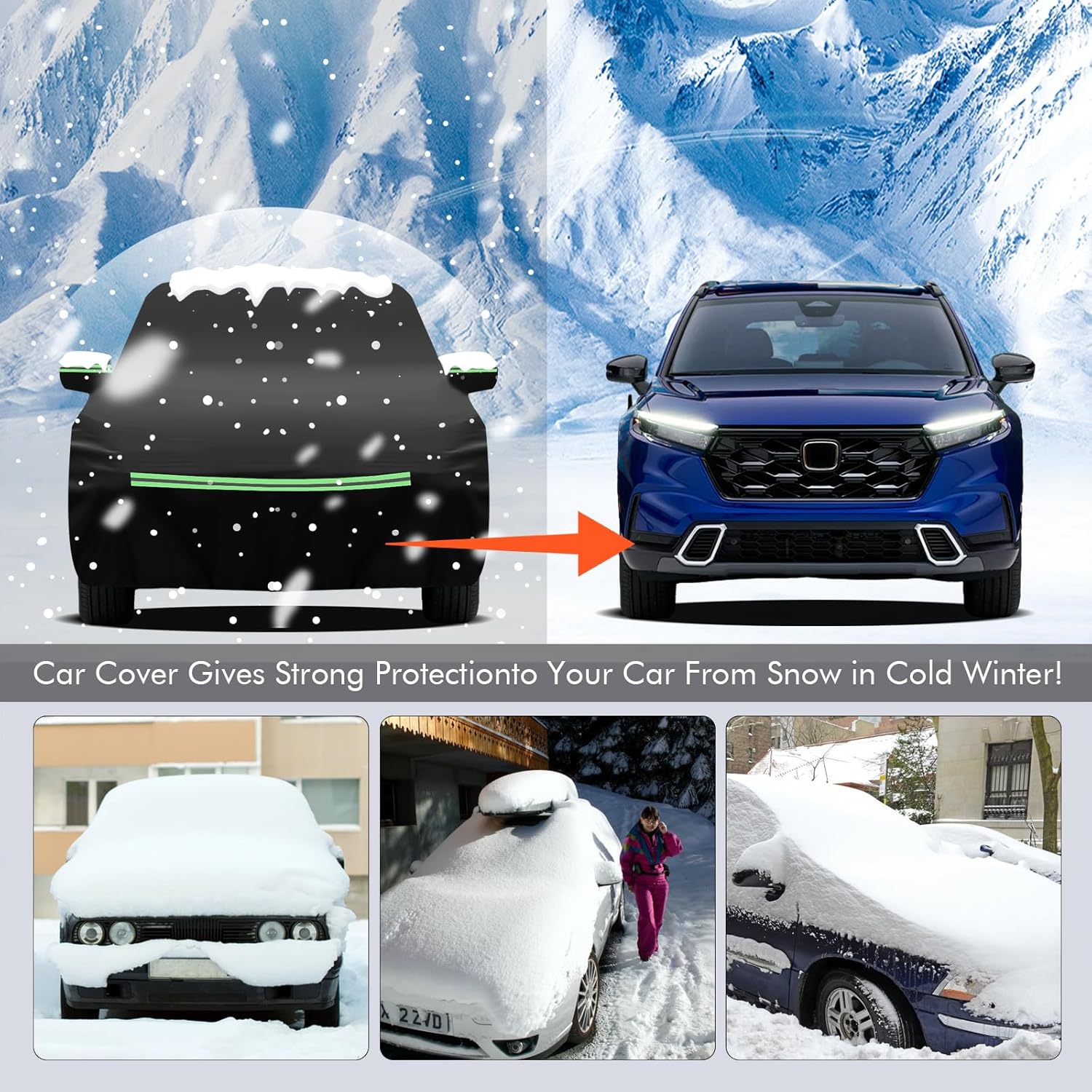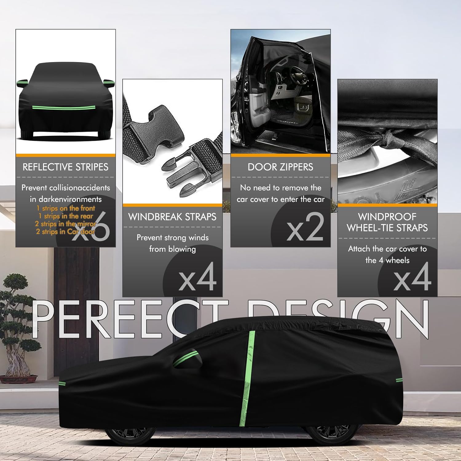 - ðãSafety and Humanizationãâ The car protection cover has 2 zippers on the front door sides to facilitate temporary access to items; â¡The 4 reflective strips are located at the front, rear and the two side mirrors of the car to prevent nighttime collisions and other accidents; â¢Custom fit shape with 2 mirror pockets for all-around protection.