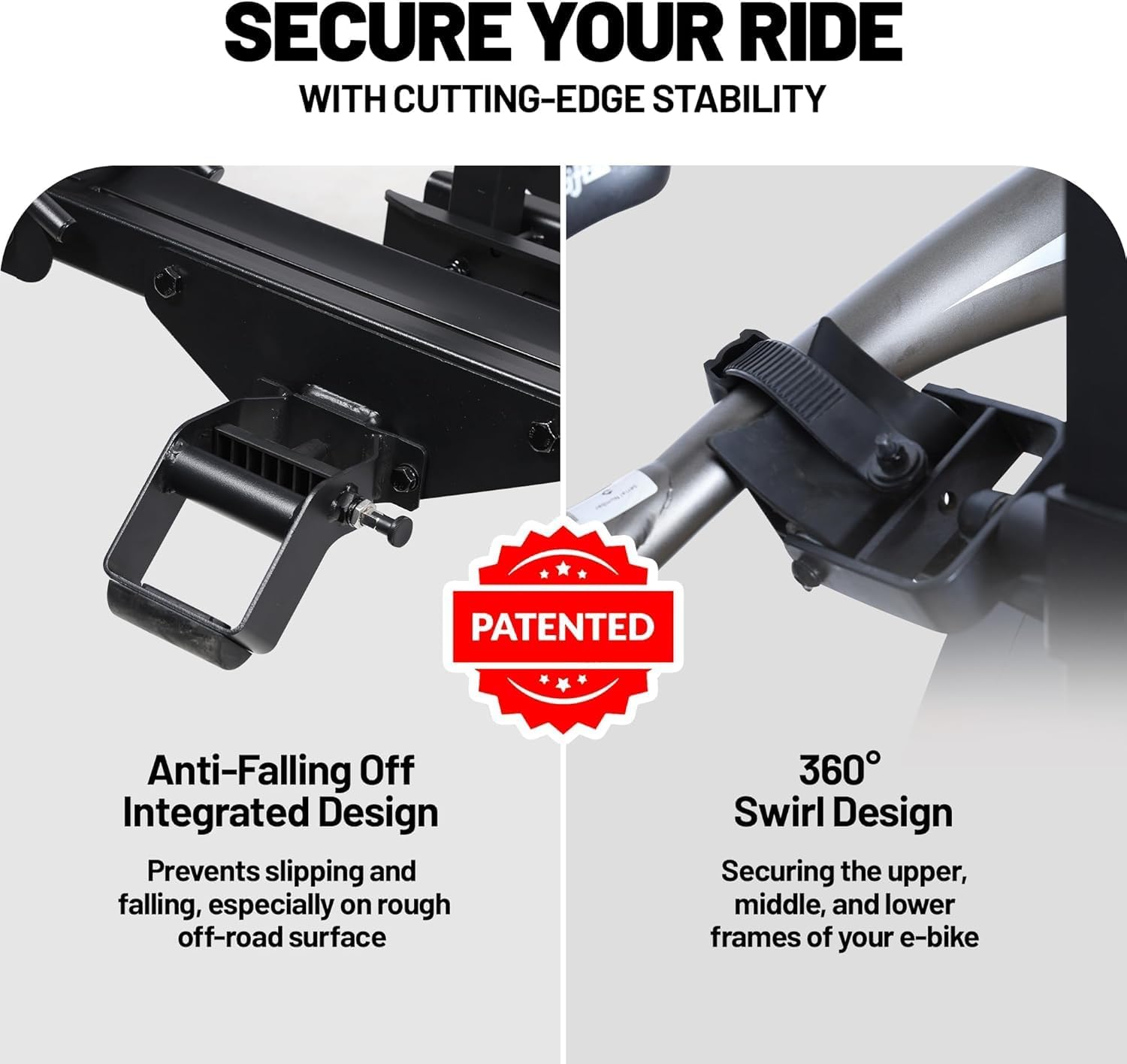 - SAFE AND SECURE ON OFFROAD: Comes with 2-arm fix, patent secure wheel cradles and anti-wobble structure, that secure your E-bikes in place without swaying and knocking against vehicle.