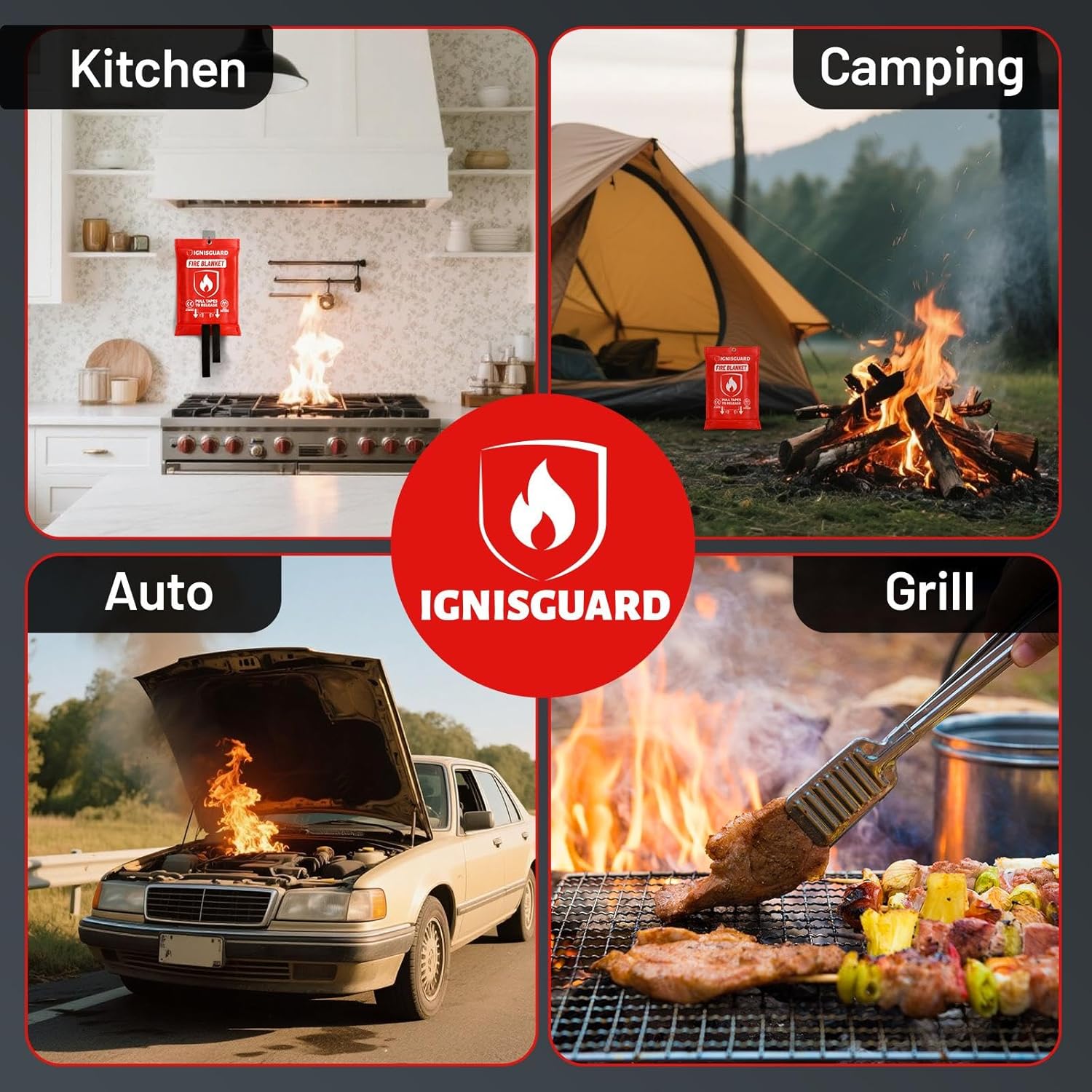 - A Must Have Fire blanket for Home and Kitchen: IGNISGUARD Fiberglass Fire Blankets 4 pack, with 1 pair 1472°F IGNISGUARD Heat Resistant Gloves and 4 Stainless Steel Hooks for hanging. They are essential emergency fire blankets for home safety and are suitable for house, kitchen, BBQ, grill, camping, grilling, backyard, vehicle, restaurant, fireplace, dormitories, etc.