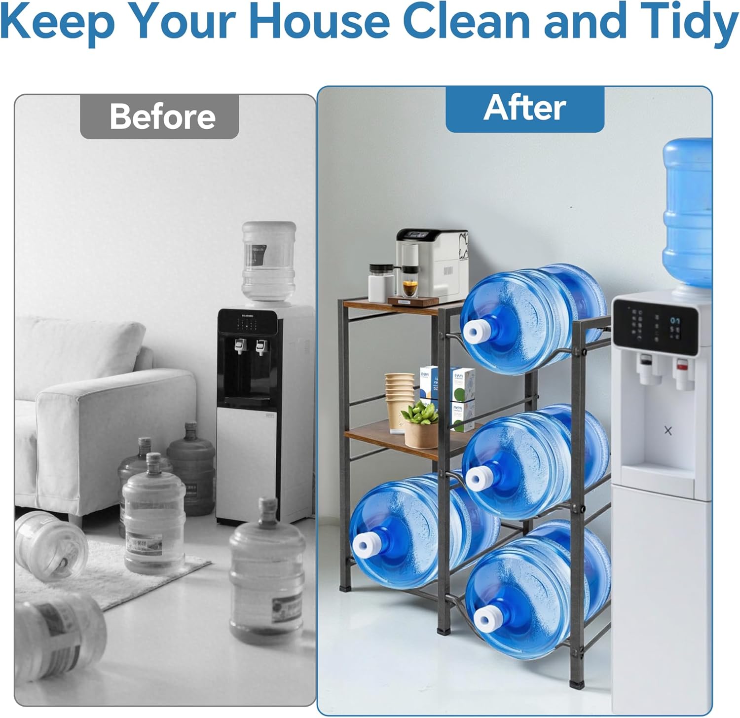 3-Tier 5 Gallon Water Bottle Holder, Heavy Duty Water Jug Rack with Wood Top Shelf, Water Dispenser Stand for Kitchen, Office, Garage