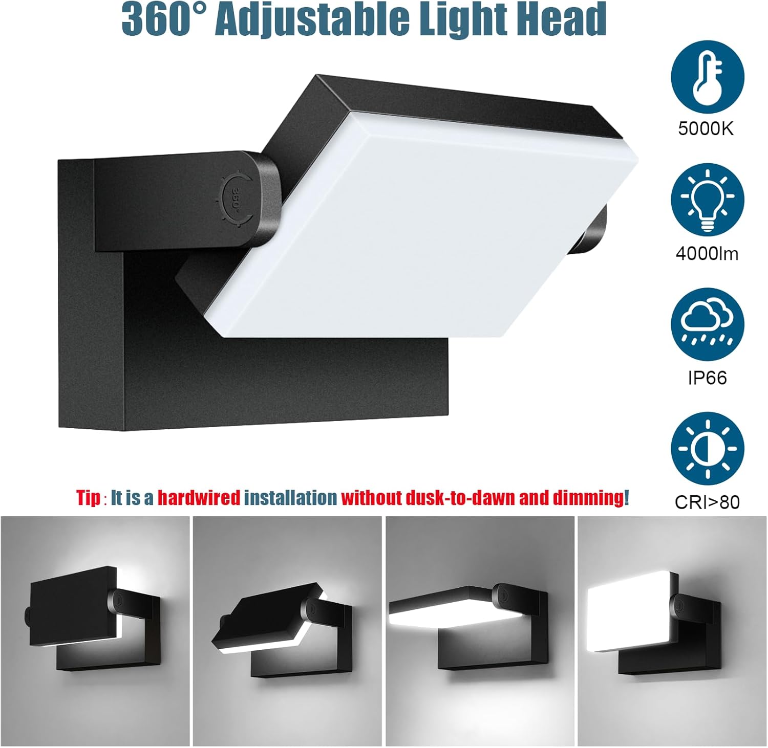 - Friendly-Light:Equipped with a 360 degree rotatable modern outdoor wall fixture led, it can accurately control the light and no longer disturb neighbors compared to fixed devices. With a white color temperature of 5000k, it will not be glaring. The size of 9.1 * 6.3 * 4.5 inches is perfect for indoor and outdoor installation, adding a sense of comfort to your home