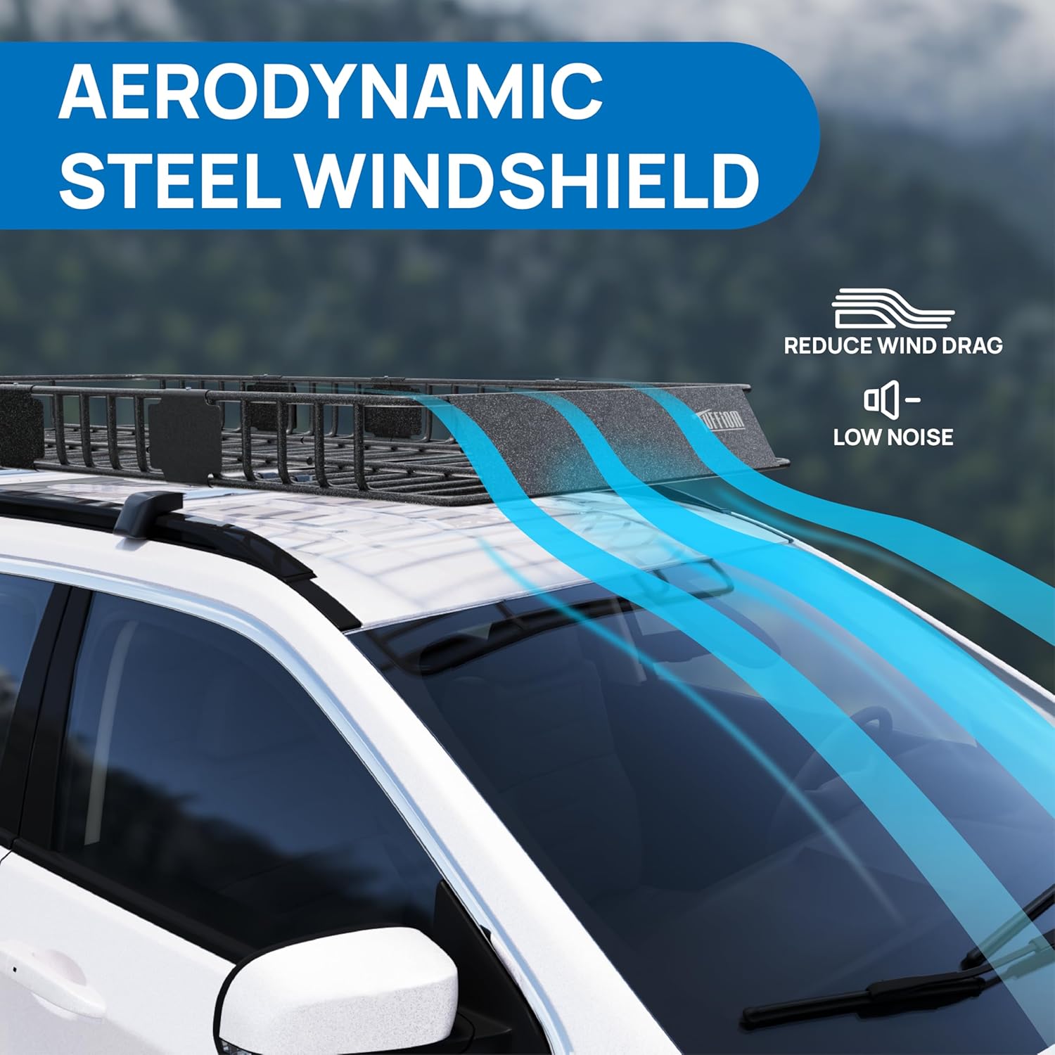 - ăSafe & Convenient DesignăFeatures a wind shield forward protect cargo from wind damage and reducing wind resistance. With a footrest, it is more convenient for you to store or take the luggage on the roof.