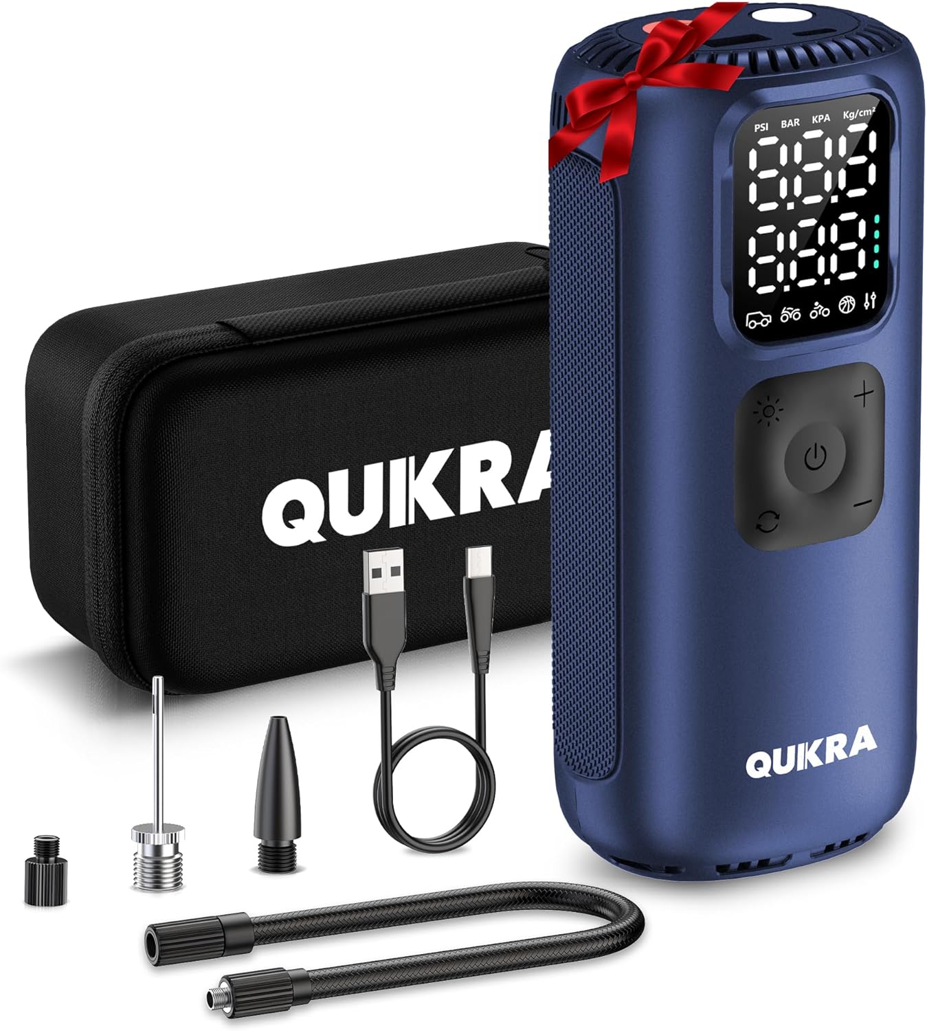 - [Package Include]: Smart portable tire inflator T22(blue)*1, storage bag*1, schrader valve air hose*1, presta valve*1, ball needle*1, type-C charging cable*1, swimming ring valve*1, service manual*1. If you have any questions, we are here to help you, QUIKRA devoted to provide premium product and customer-satisfying service
