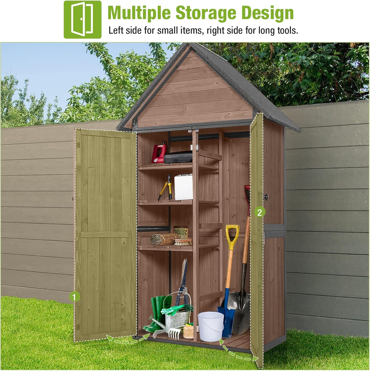 GUTINNEEN Sheds Outdoor Storage Wooden Garden Tool Shed with Metal Frame Sloped Roof and Adjustable 3 Tiers Shelves Outdoor Storage Cabinet for Backyard Garden Patio Lawn 67.1"(Dark Brown)