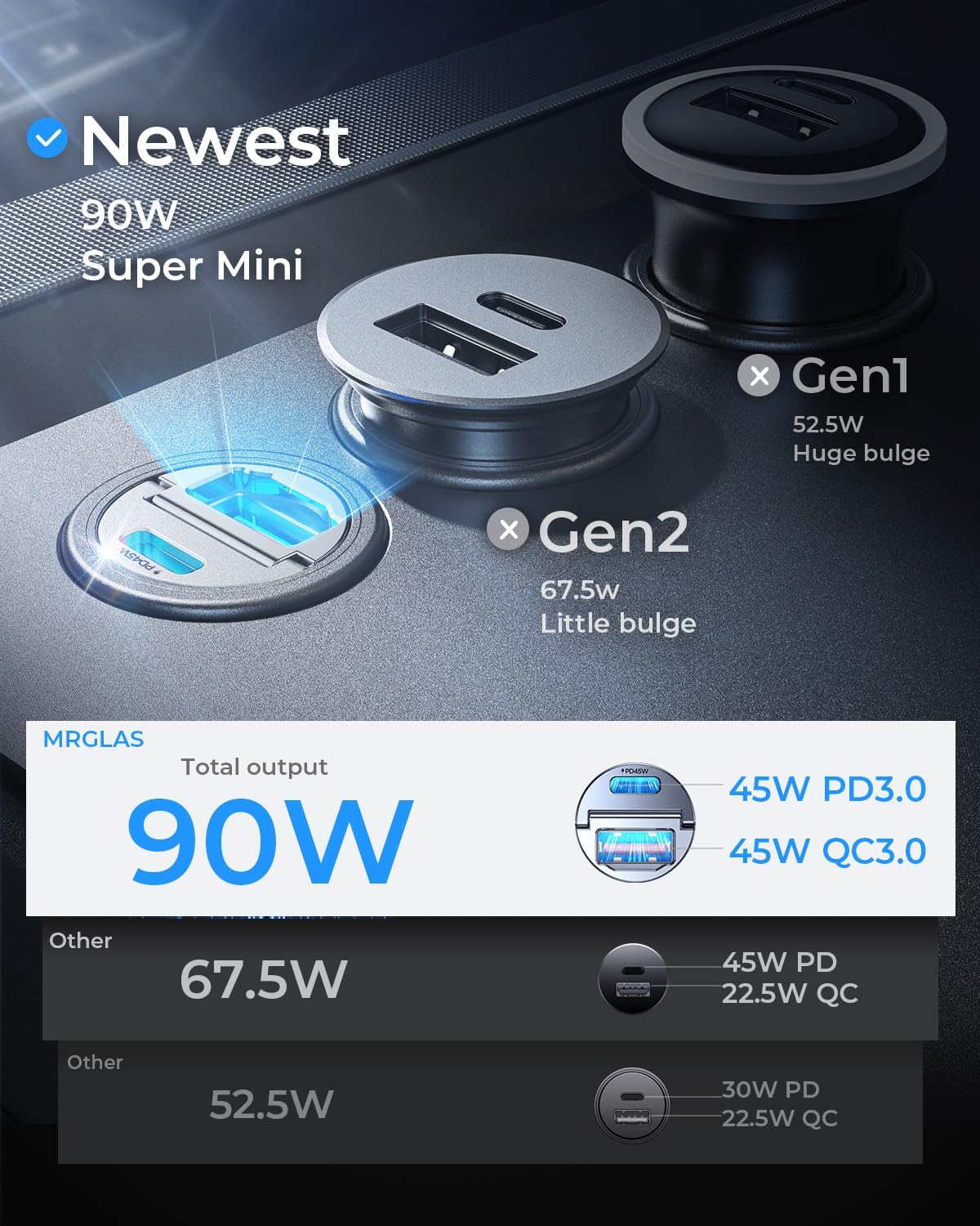 - PD45W+QC45W SUPER FAST CHARGING: MRGLAS 90W car charger adapter fast charging supporting PD 45W(usb-c port) and QC 45W(usb-a port) high output, Can fast charge all prevailing phones/iPad/tablet at the same time. Makes the IPhone 16 Pro Max and Samsung Galaxy S25 charging time from 0% to 89% in 30 minutes
