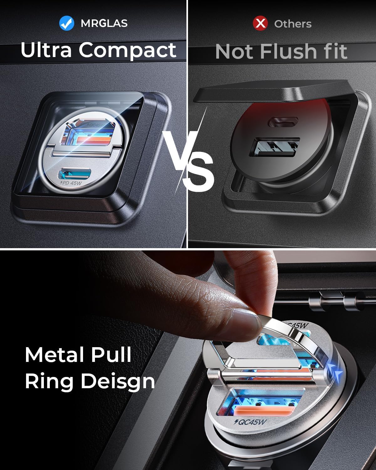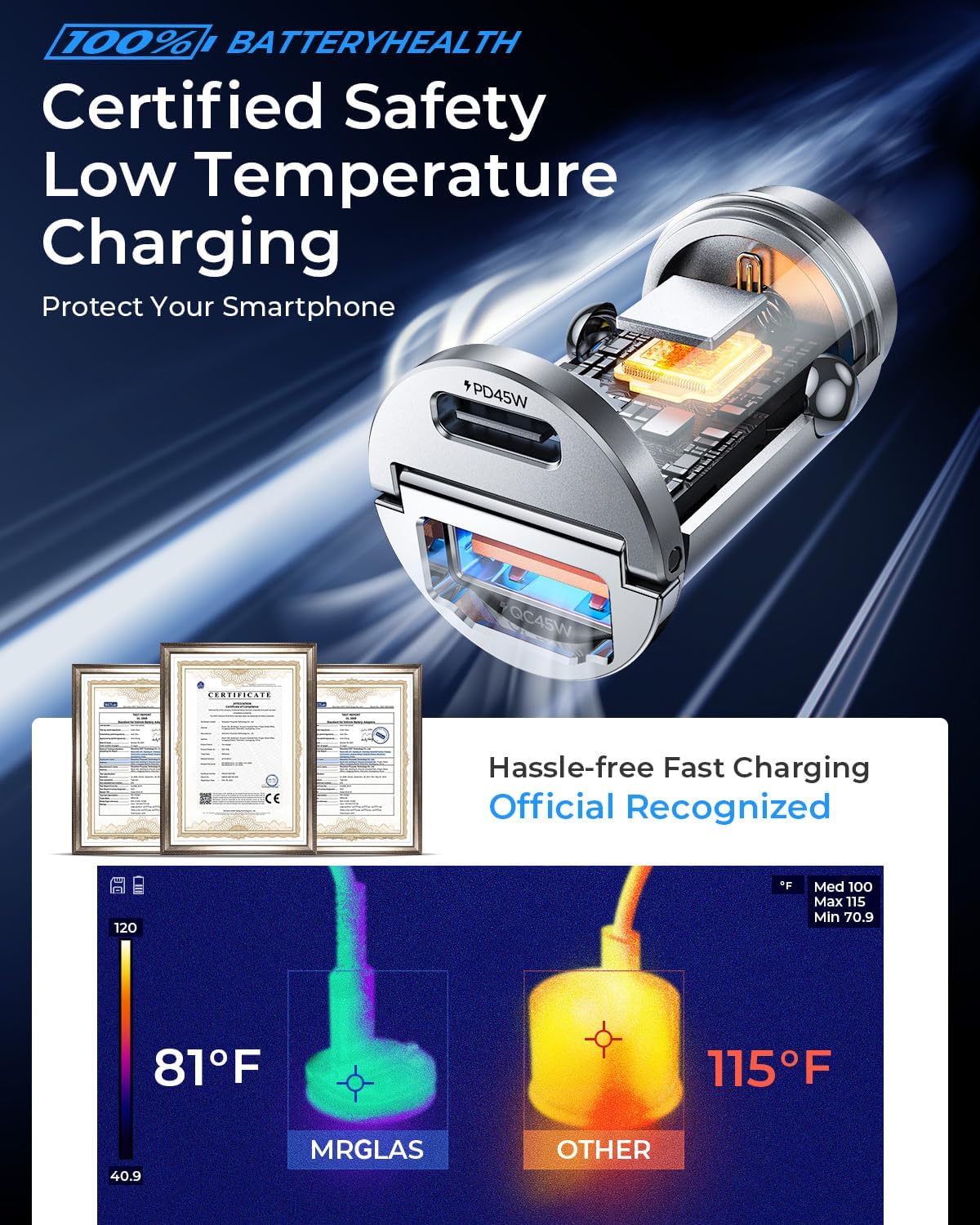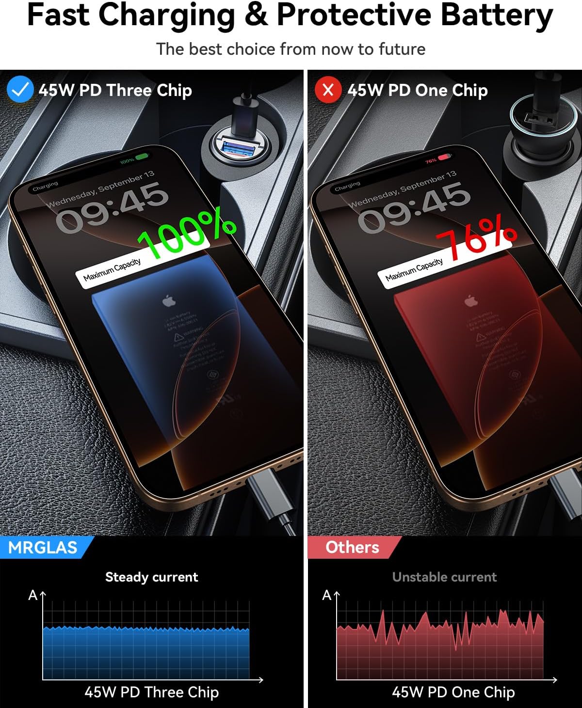 - OFFICIALLY APPROVED CHIP, AIM FOR FASTER & SAFER: MRGLAS fast car charger adapter Built-in PD45W&QC45W dual-core intelligent identification chip outputs 45W of fast charging current in each of its two cores, And the latest security control chip, which is a safe and high-speed Fast Car Charger without damaging the device