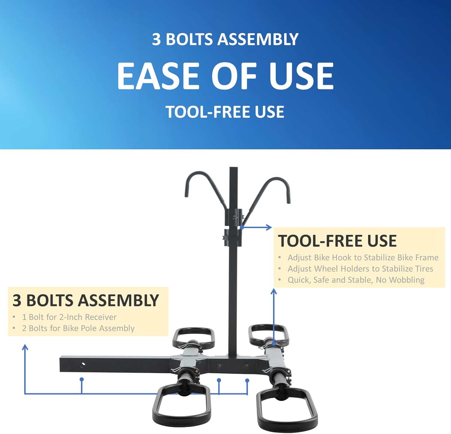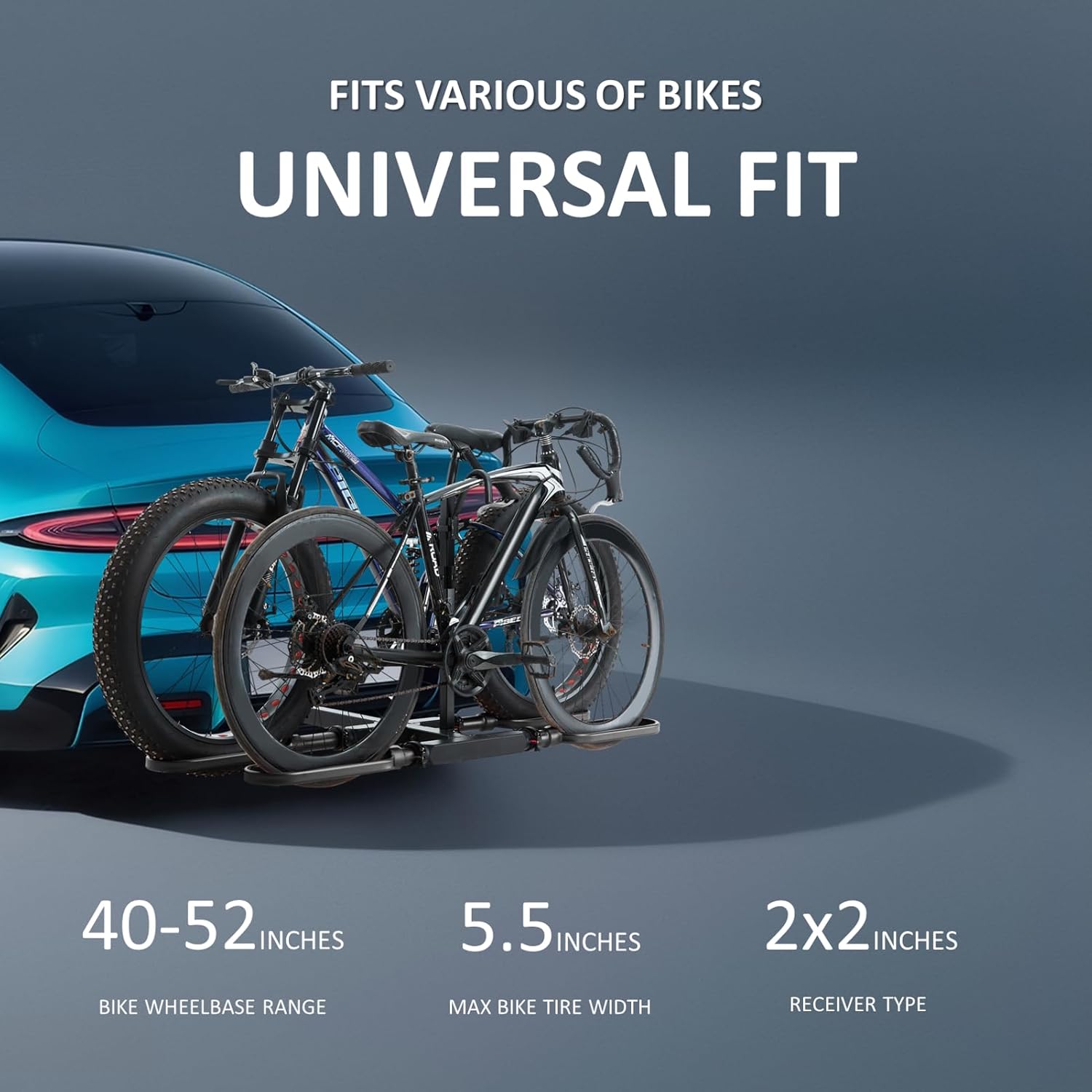 - Ease of Use for 2-inch Receiver Vehicles: Easy to set up in minutes with a simple 3-bolt assembly. This bike rack for car is easy to install, remove and store. This 2-bike bicycle car rack is for 2-inch receivers only, best choice of bike rack for truck, SUV, RV and van. It's the go-to choice for travelers, cyclists, and commuters seeking convenience