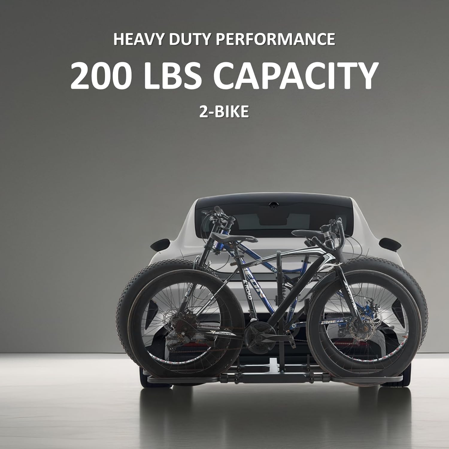 - Fits 2 Heavy-Duty Bikes: Elevate your outdoor trips with our robust aluminum hitch bike rack. It supports 40-52β wheelbase, tires up to 5.5β, and total 2-bike weight of 200 pounds. This makes it an excellent fat tire bike rack, and secure ebike rack. It also carries mountain, road, fat-tire ebike, electric bicycles etc.