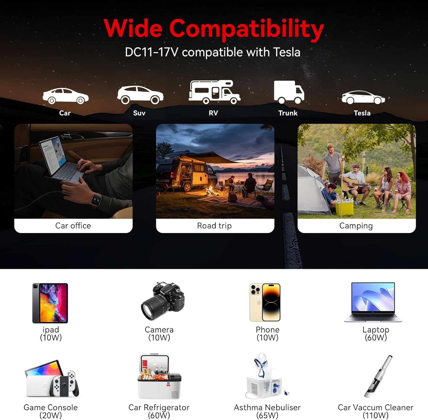 - ăCompatible with TeslaăThe input voltage of the inverter is 11-17V, perfectly suitable for the 16V cigarette lighter socket of Tesla vehicles.