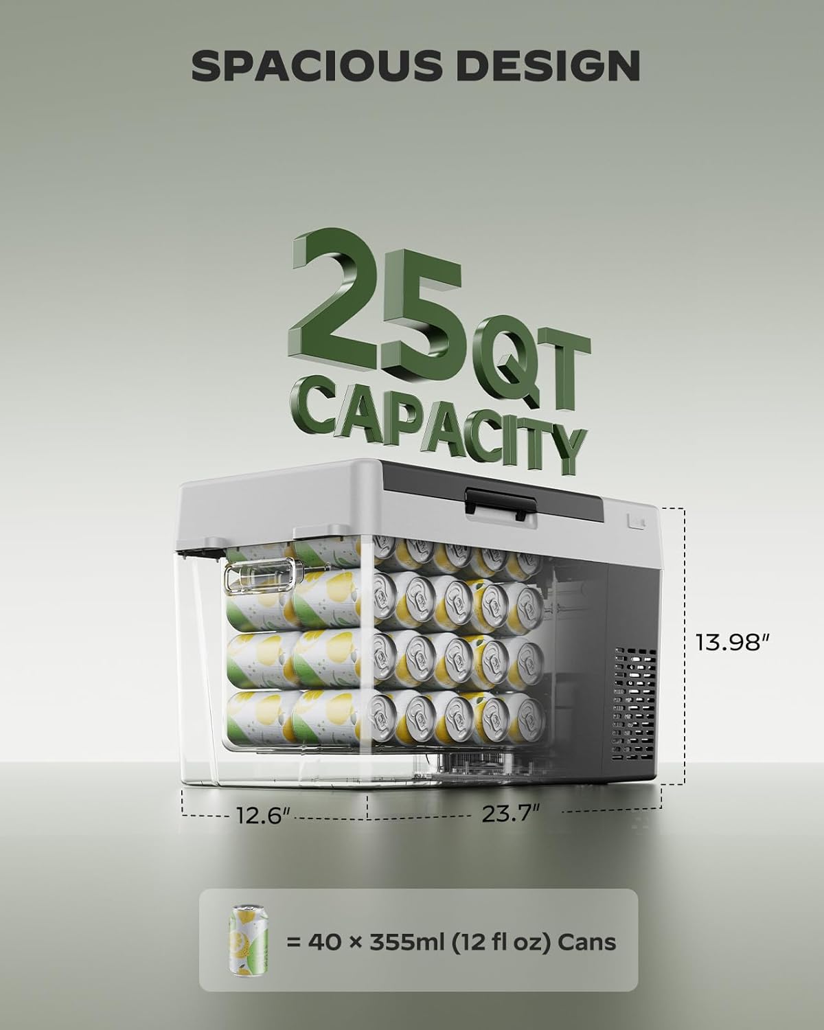 - Compact 25QT Design for Efficient Storage:The 25QT portable freezer offers just the right amount of space for essential foods and drinks, holding up to 40 cans of 330ml drinks. This car fridge is compact, portable, and great for small groups or short trips, providing ample space without taking up unnecessary room.