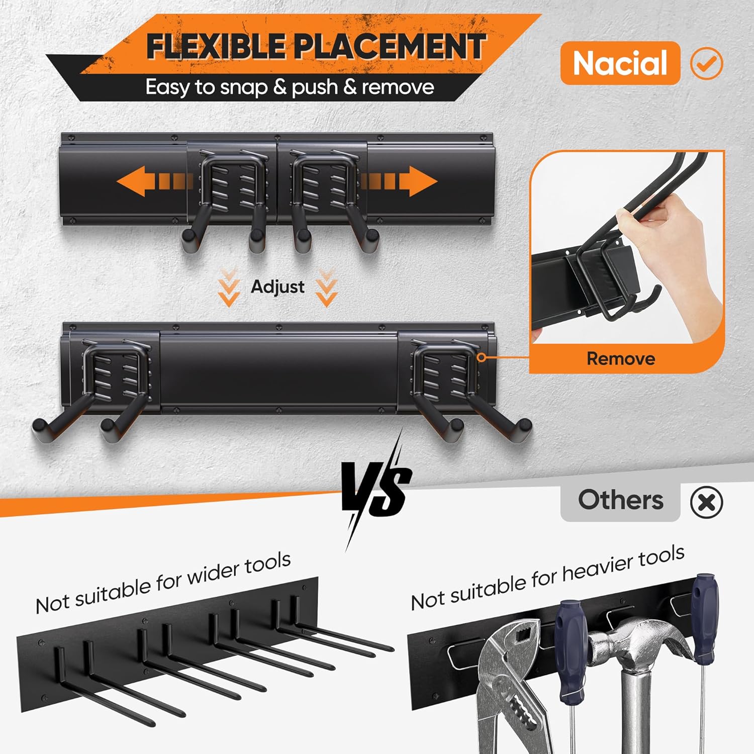 - 64-Inch Adjustable Garage Wall Tool Rack – Nacial Garage Tool Organizer Wall Mount includes 4*16" rails, 8 hooks (4*10" double-layer hooks, 4*9.4" tool hooks) and 4 storage straps. The 64-inch wall-mounted rack allows for flexible tool organization, with hooks that snap onto the rail and can be easily repositioned to accommodate tools of all sizes. Ideal for your garage, utility room, workshop, or basement. Elevate Your Organization—Get Your Nacial Garage Tool Organizer Today!